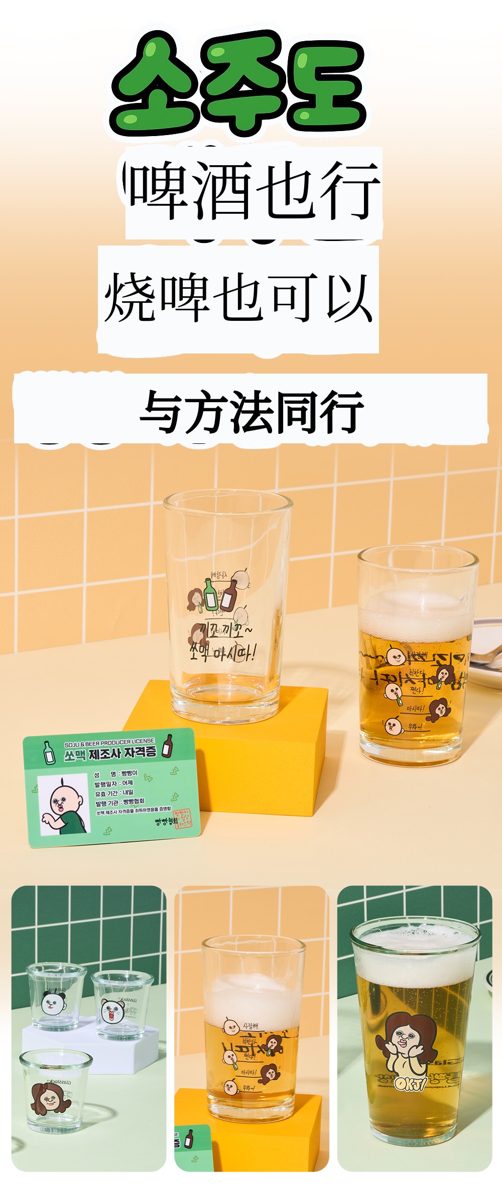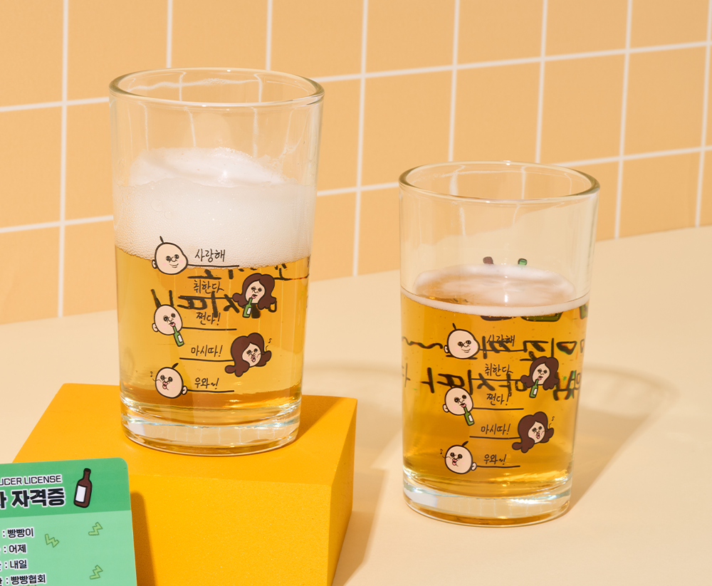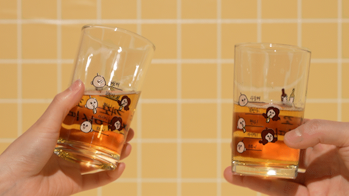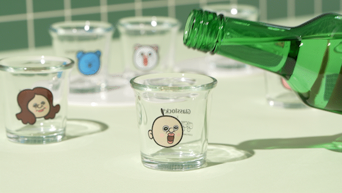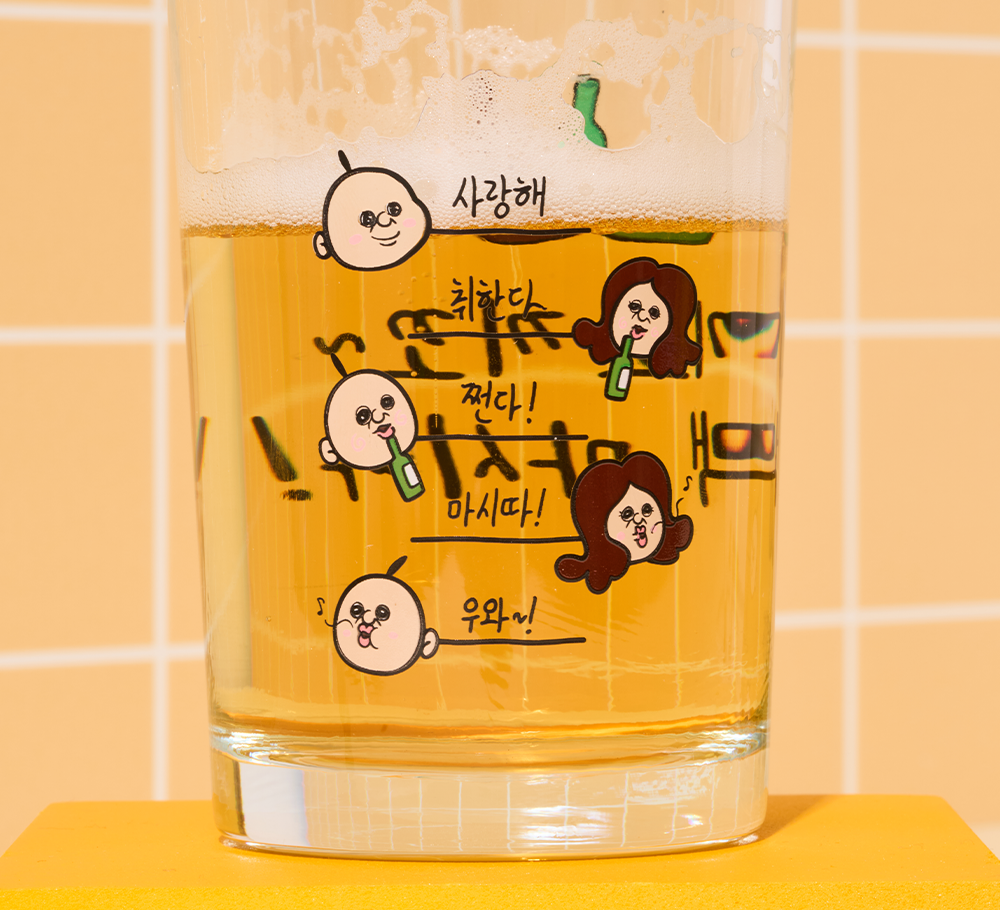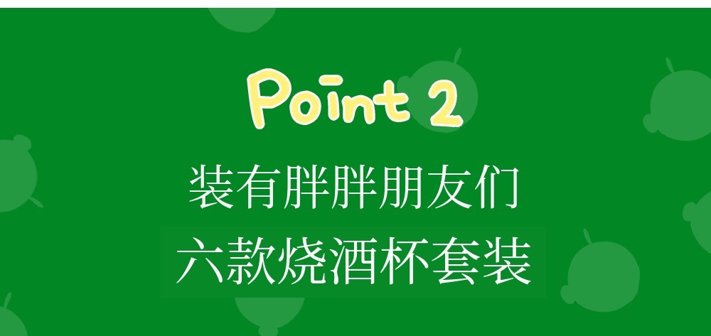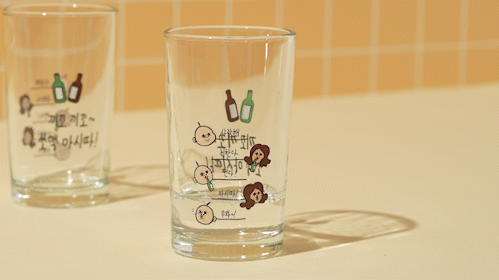 杯子上将烧酒的比例分为5个阶段并标有刻度。每个比例上都写有胖胖的感性文句。