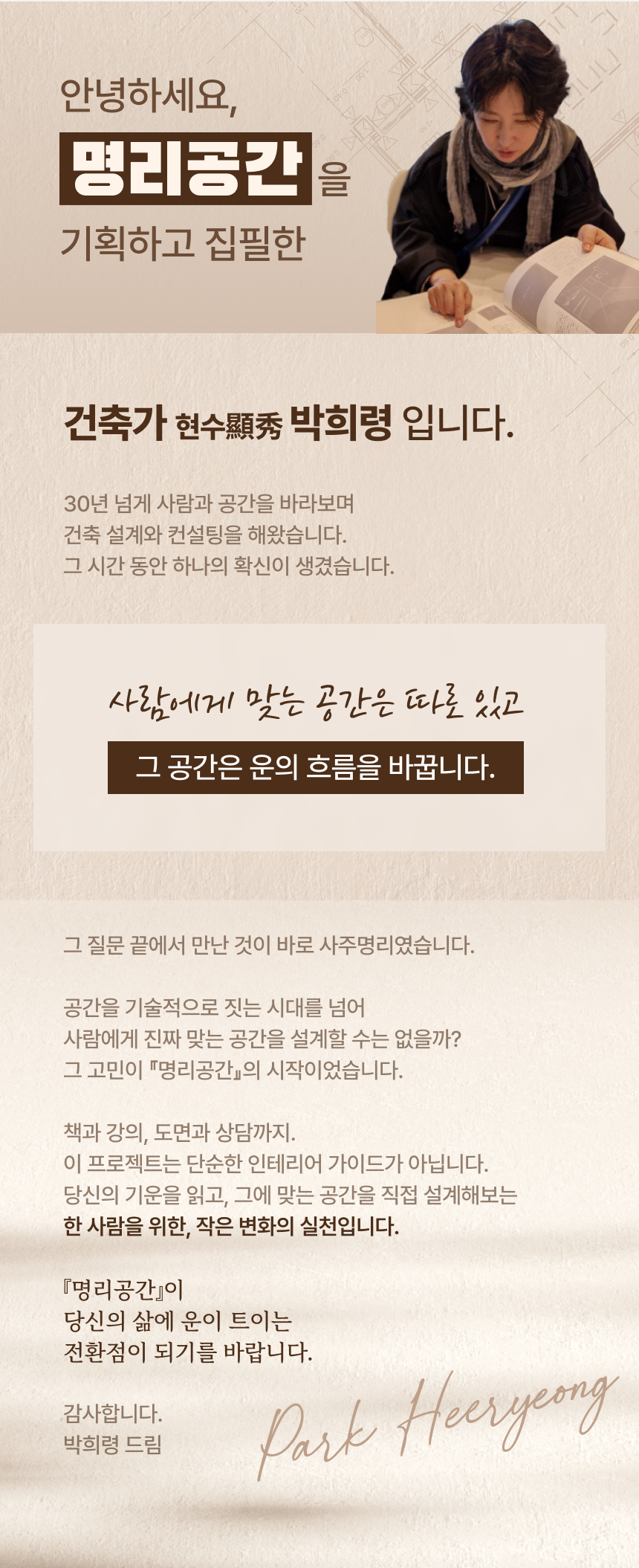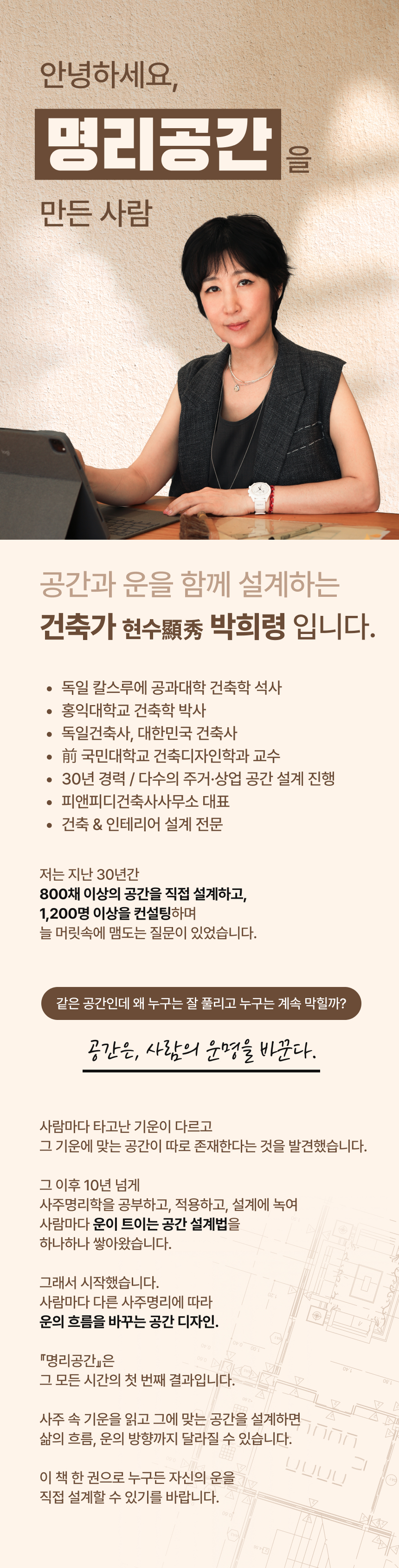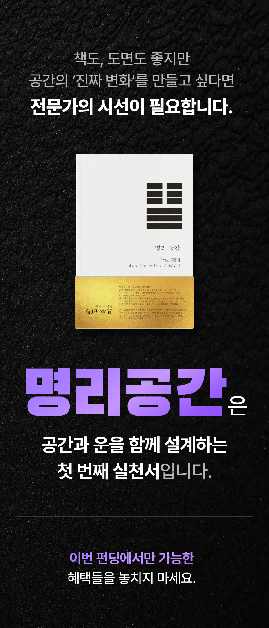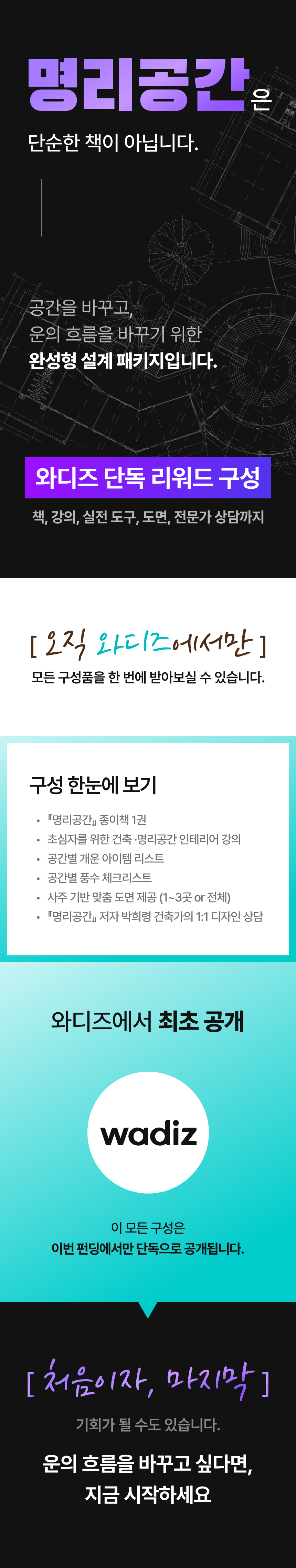 명리공간 책을 와디즈를 통해 최초로 공개하는 이유는 책의 성격 상 컨설팅과 강의를 리워드로 묶어서 판매할 수 있고 선공개를 통해 소비자들의 구매의사를 먼저 알아볼 수 있는 매우 좋은 플랫폼이라 생각했기 때문에 선택했습니다.