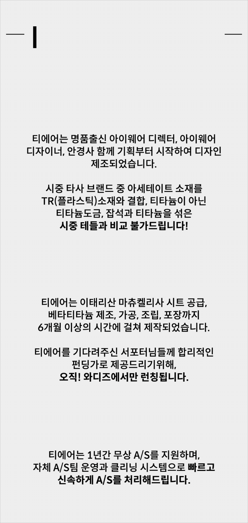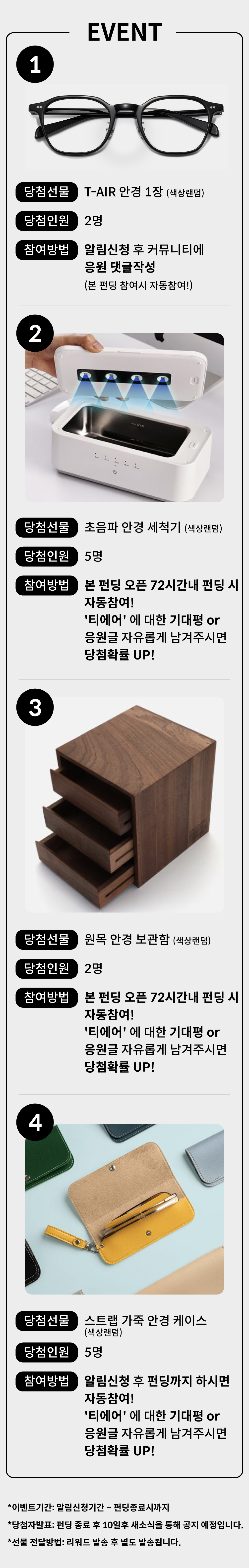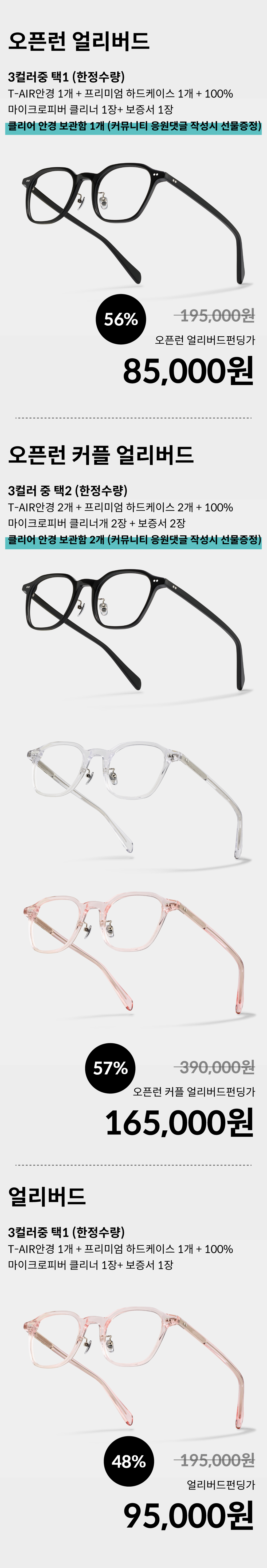 ⚠ 카드 잔고부족, 한도초과, 분실/정지 카드 등의 사유로 결제 실패하신경우: 최종 결제일 4시30분까지 [ 나의 리워드 -> 최근펀딩 -> 티에어 안경 펀딩클릭 -> 결제정보변경 -> 직접입력 ] 페이지에서 카드변경을 하실수 있습니다.