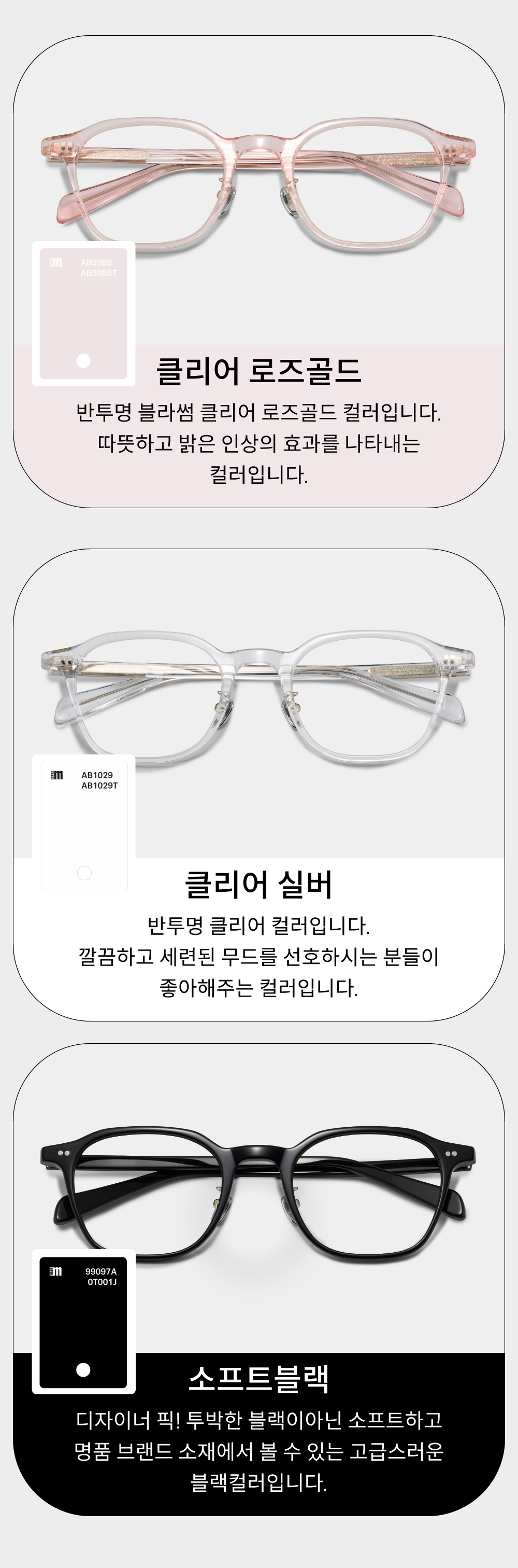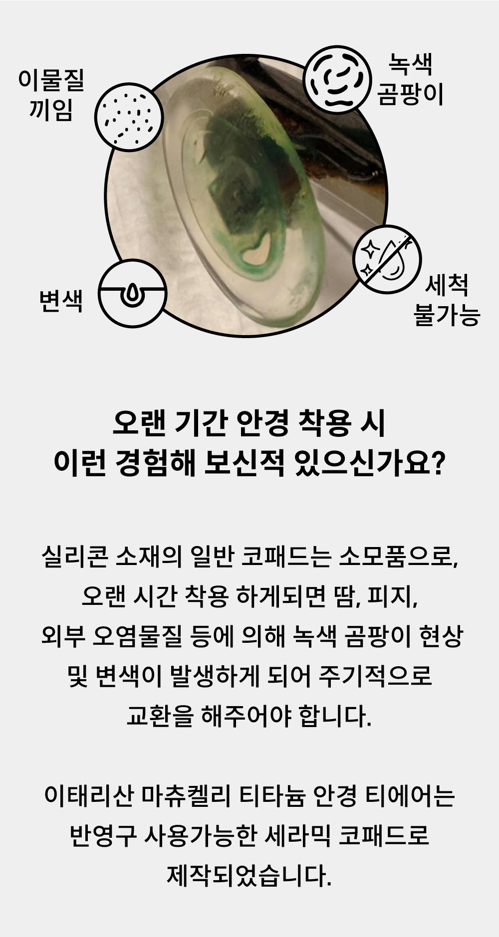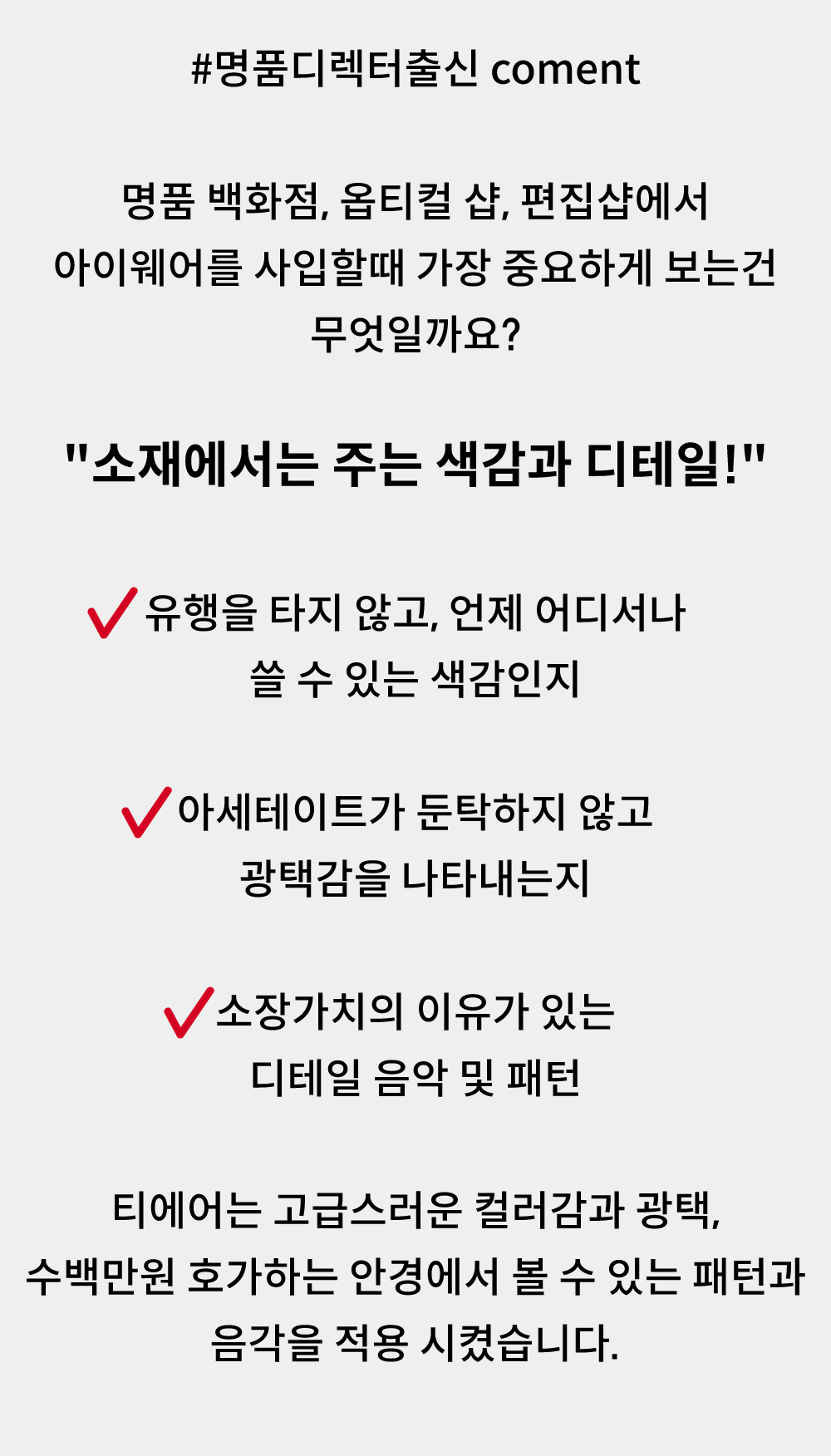 - 아세테이트 귀팁 사이에 먼지, 땀 및 액체류등 이물질이 들어가 변색 및 티타늄도금이 박리될수있으니 유의바랍니다.
