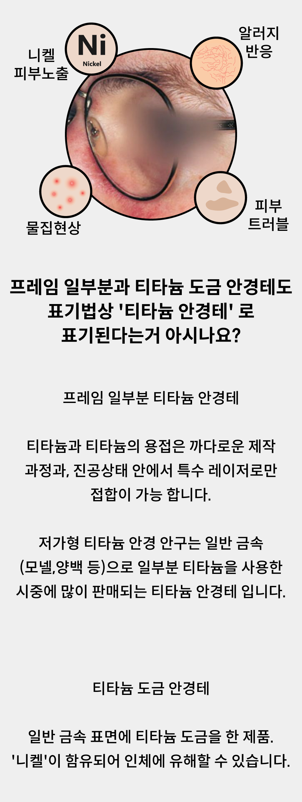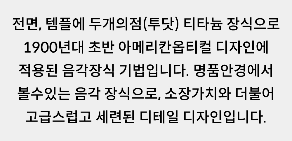 - 티타늄 소재는 외부오염물질이 묻은 상태로 오랫동안 방치시 도금이 박리 될수있습니다. 오염물질이 묻은경우 안경을 자주 세척해주세요.