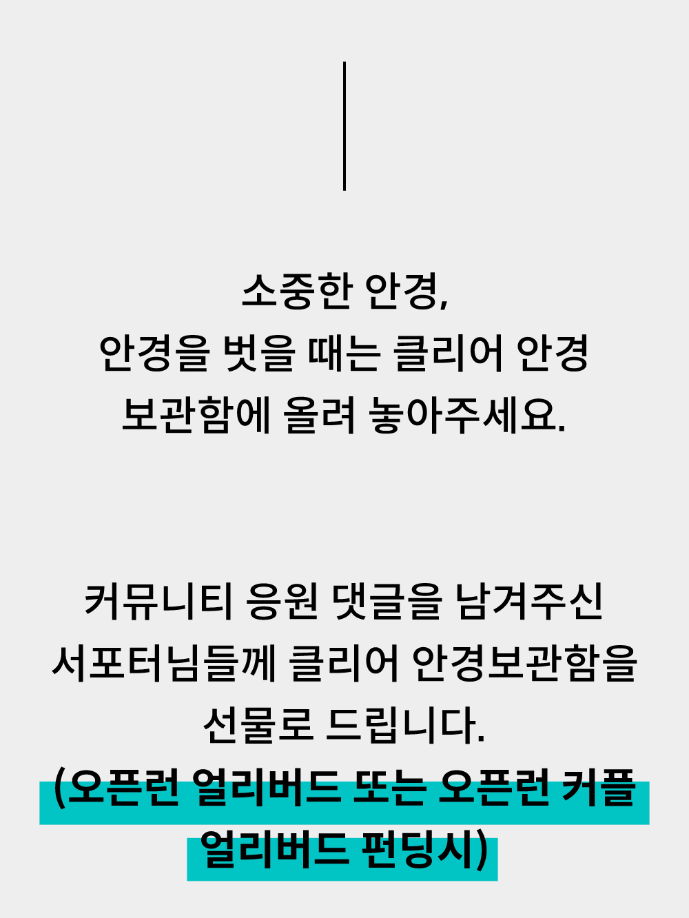 ☑ 잔고부족, 한도초과, 분실/정지 카드등의 사유로 결제 실패신 경우: 최종결제일 오후 4시30분까지 [ 나의 리워드 -> 최근펀딩 -> 티에어 안경 펀딩 클릭 -> 결제 정보변경 -> 직접입력 ] 페이지에서 카드를 변경하실수 있습니다.