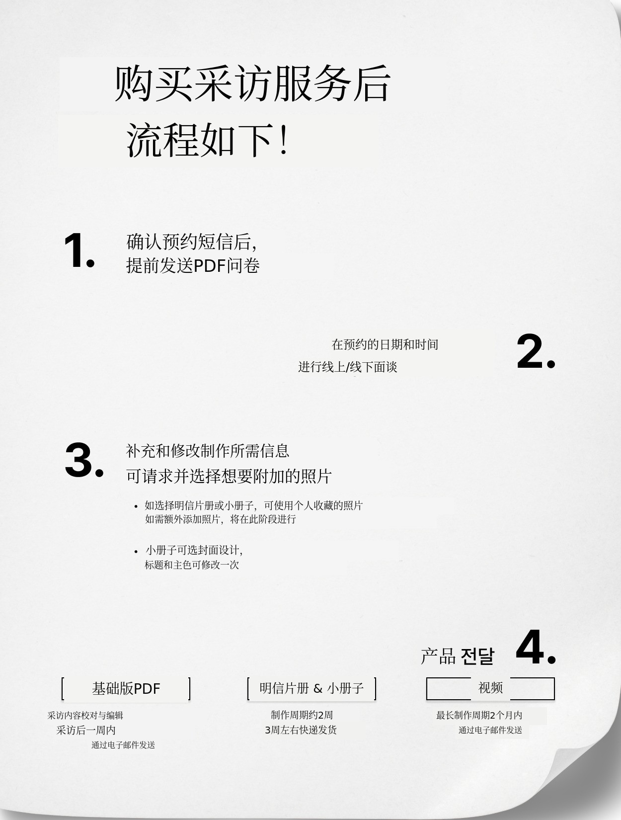 拍摄方式:选择视频采访的朋友们将在首尔租用拍摄工作室进行拍摄,具体位置之后协商。没有额外费用。(不提供服装、发型、化妆,不支持户外拍摄)