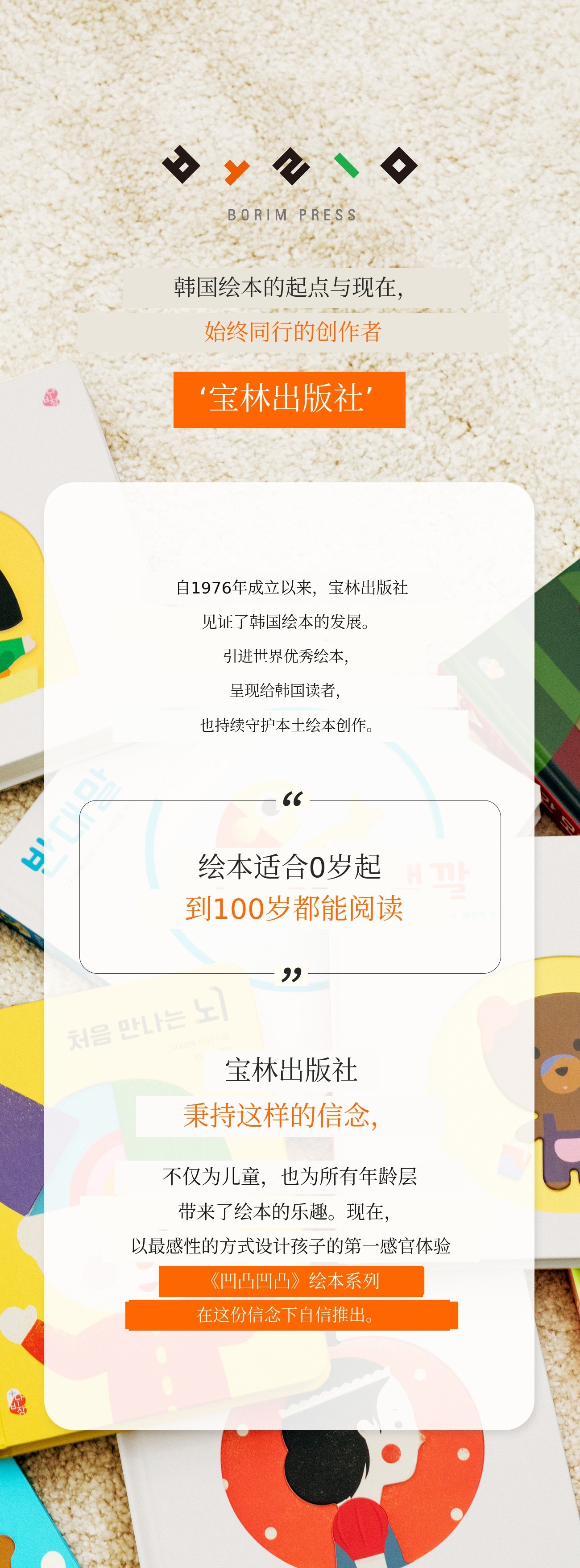 博林出版社成立于1976年,一直致力于介绍作为独特艺术类型的绘本世界。与韩国现代绘本历史一同起步,不仅介绍了许多海外优秀书籍,也持续出版了本土作家的原创绘本。通过涵盖虚构与非虚构的多样系列,我们坚信绘本是0岁到100岁都能欣赏的艺术作品。今后也将以创新和冒险精神,不断拓展绘本的外延,让其覆盖所有年龄层和各个领域。