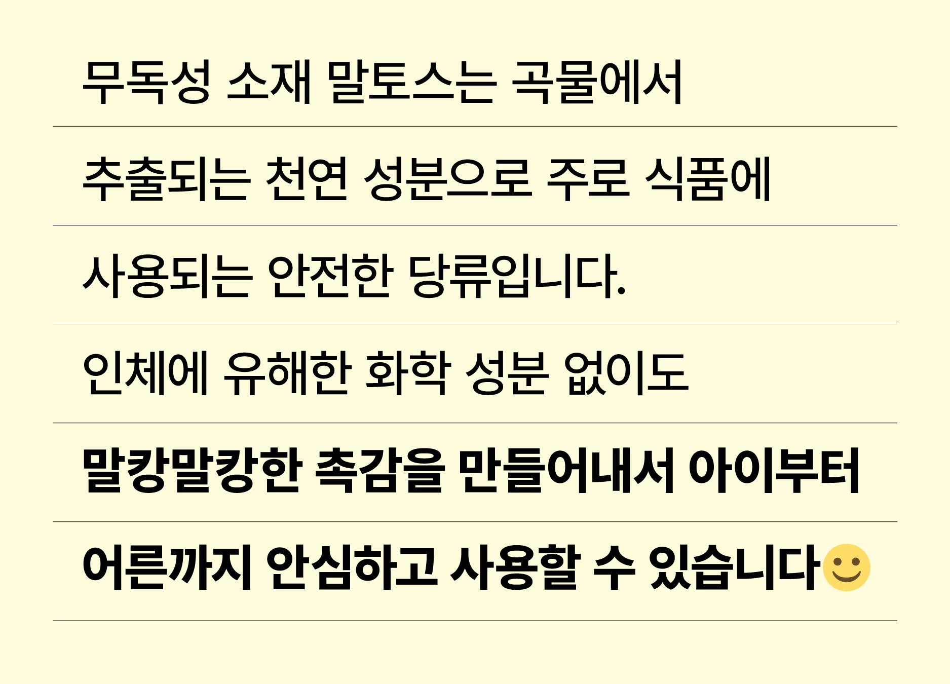 100% 식물성 원료인 맥아(말토스) 추출물로 제작되어, 인체에 무해하고 환경에도 부담을 주지 않는