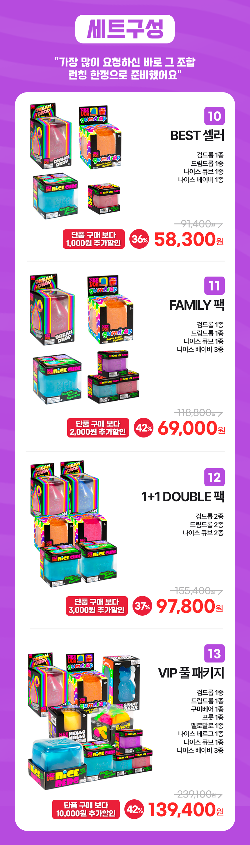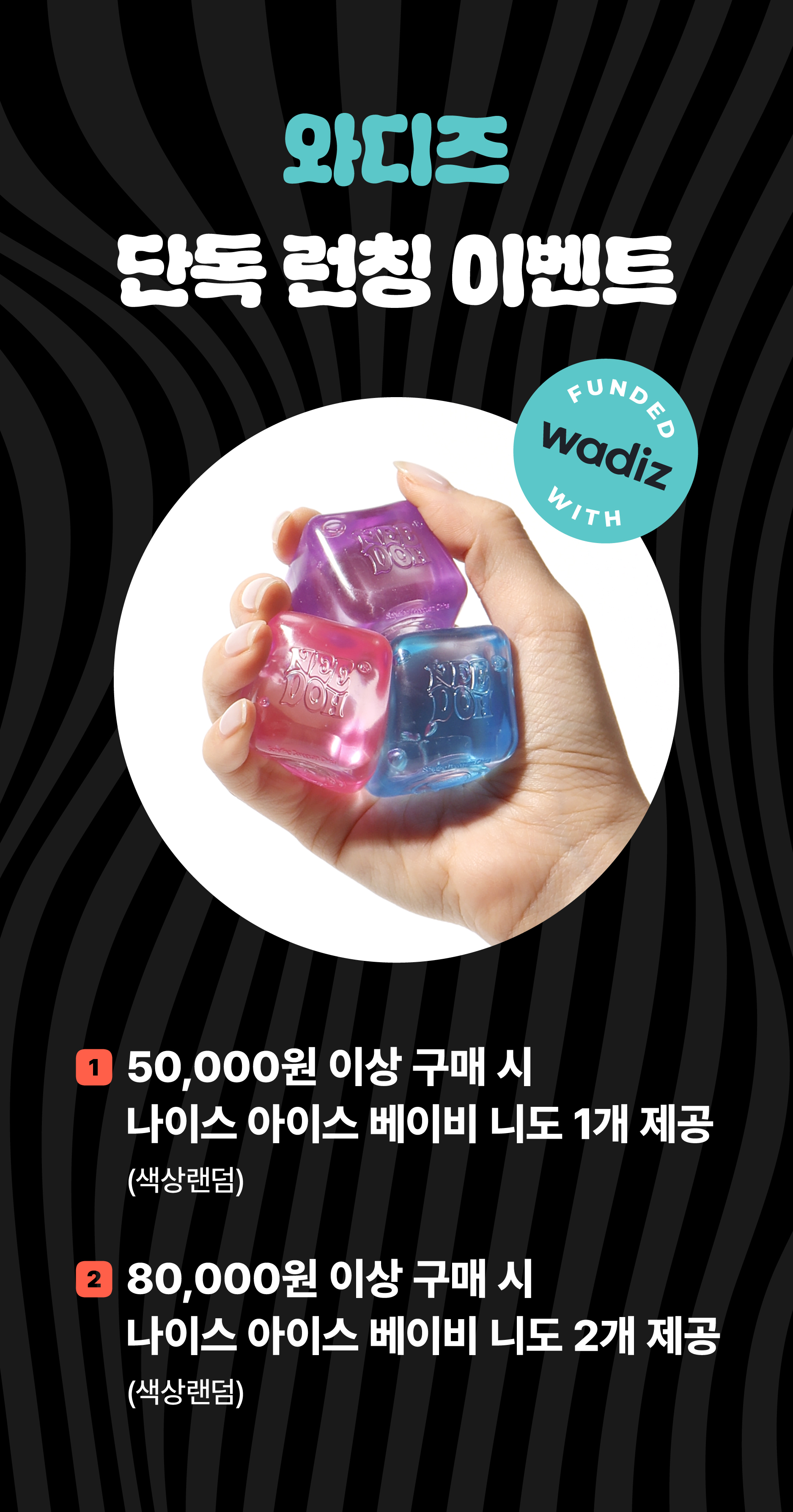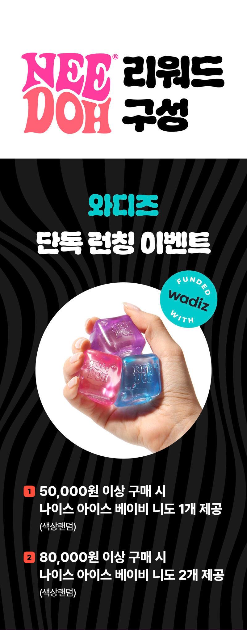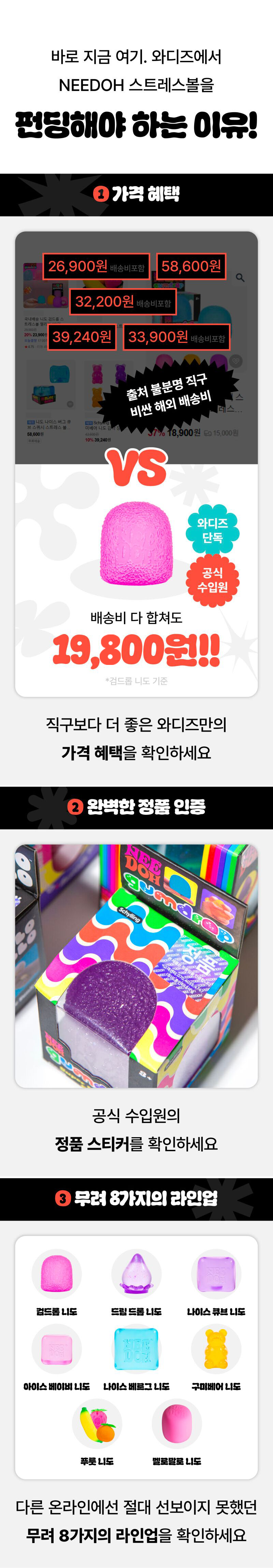 이번 한국 정식 런칭을 기념해가장 먼저 NeeDoh 만나보실  있도록  와디즈 서포터님들께만 드리는 단독 구성과 특별한 혜택으로 준비했습니다.