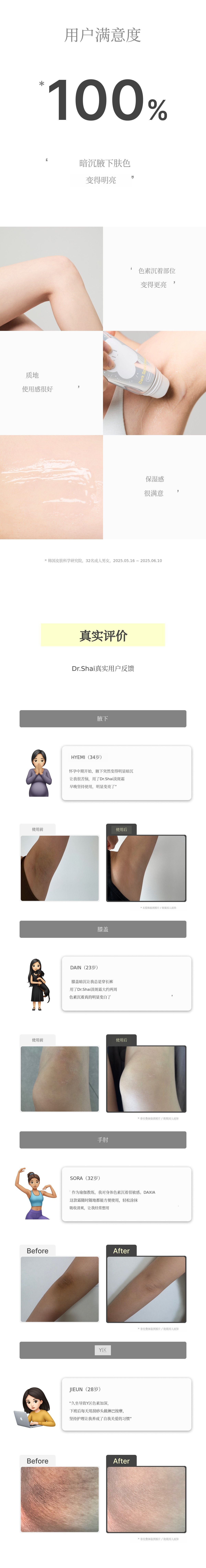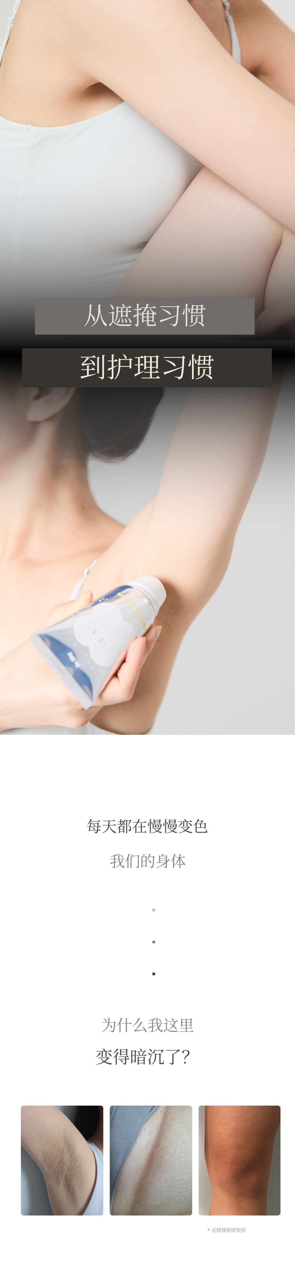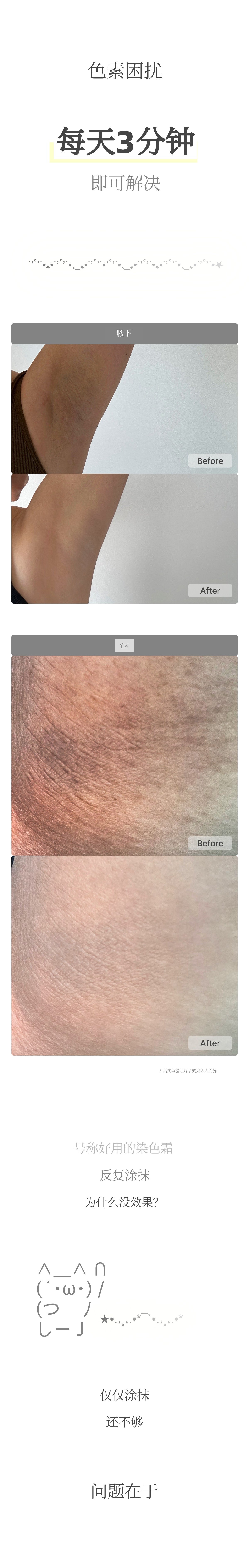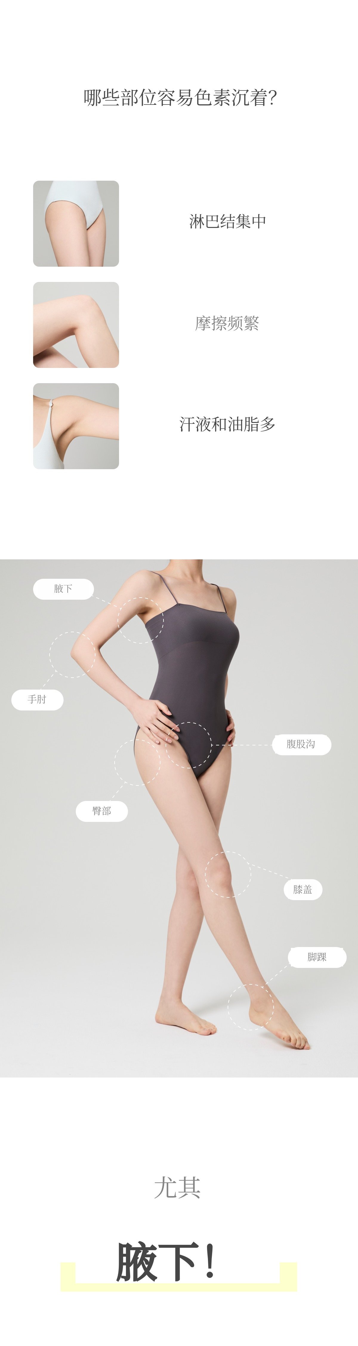 A. 腋下、私密部位、手肘、膝盖等色素沉着困扰的部位都可以使用。但请勿用于外阴或阴道内部。面部可以少量使用,但不建议涂抹于包括眼周在内的整个面部。