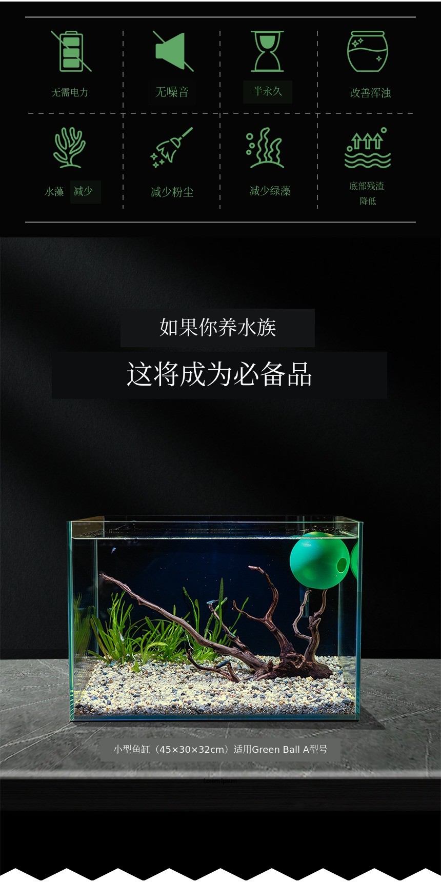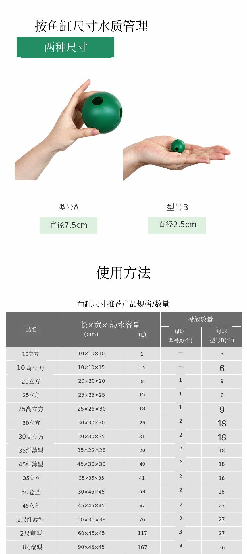 * 绿球通过材料与水中有害菌接触来净化水质,只需将产品投入正在使用的鱼缸即可。