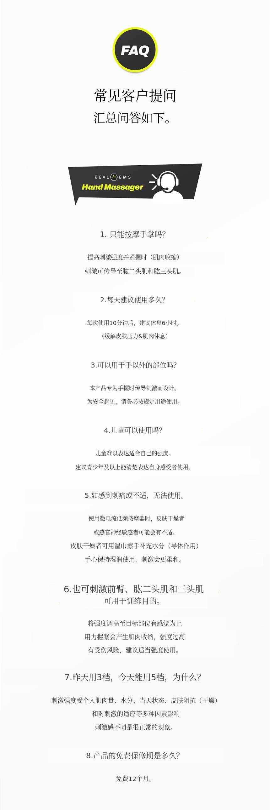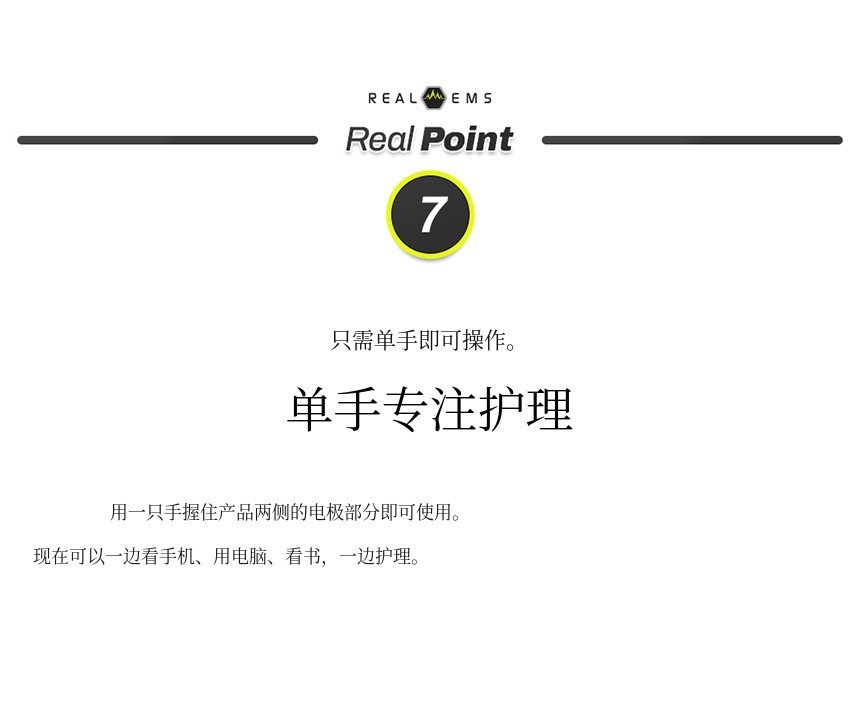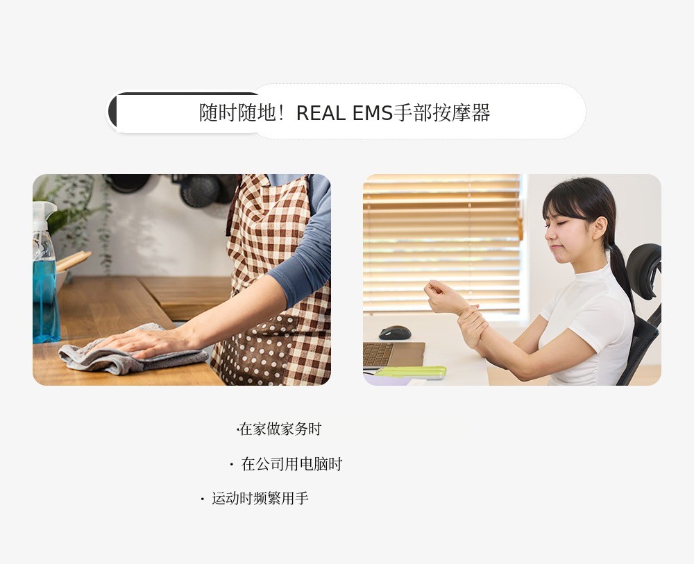 我们注意到了这一点。不仅仅停留在“按摩”功能,利用低频EMS技术,有效收缩和放松肌肉,改善不适的功能性产品 是非常有必要的。因此,我们基于RealEMS系列的技术和经验,开发了专为手部设计的EMS按摩器。