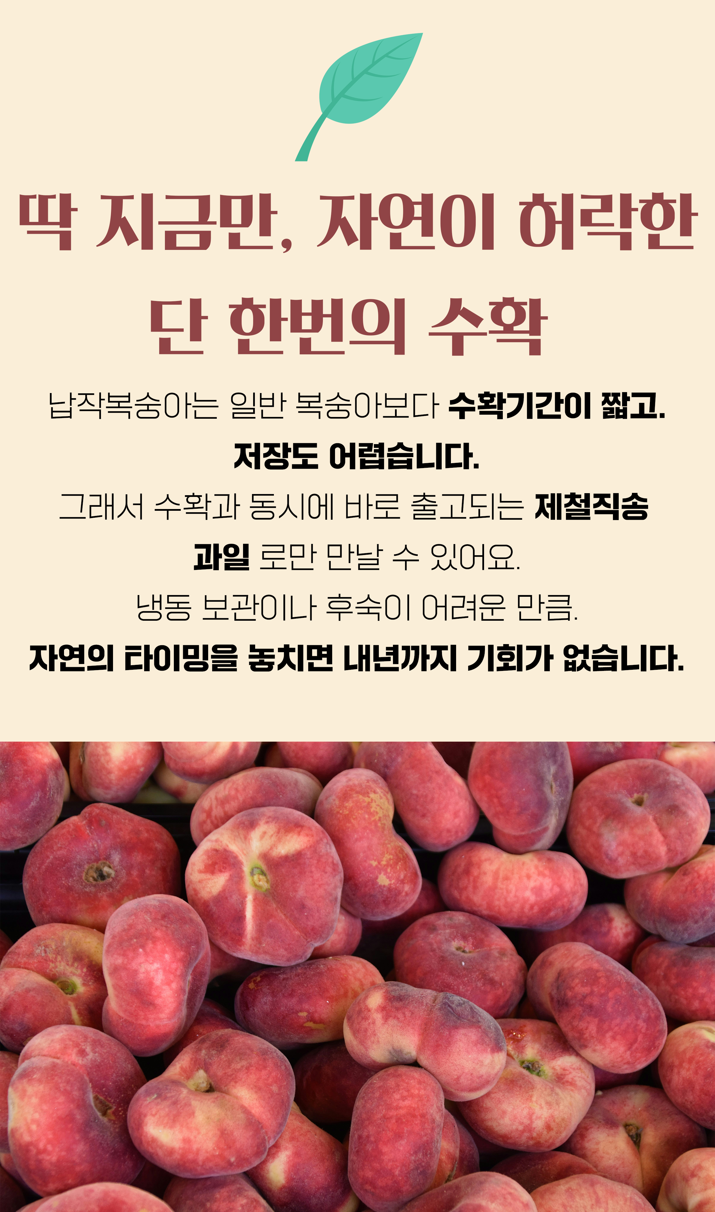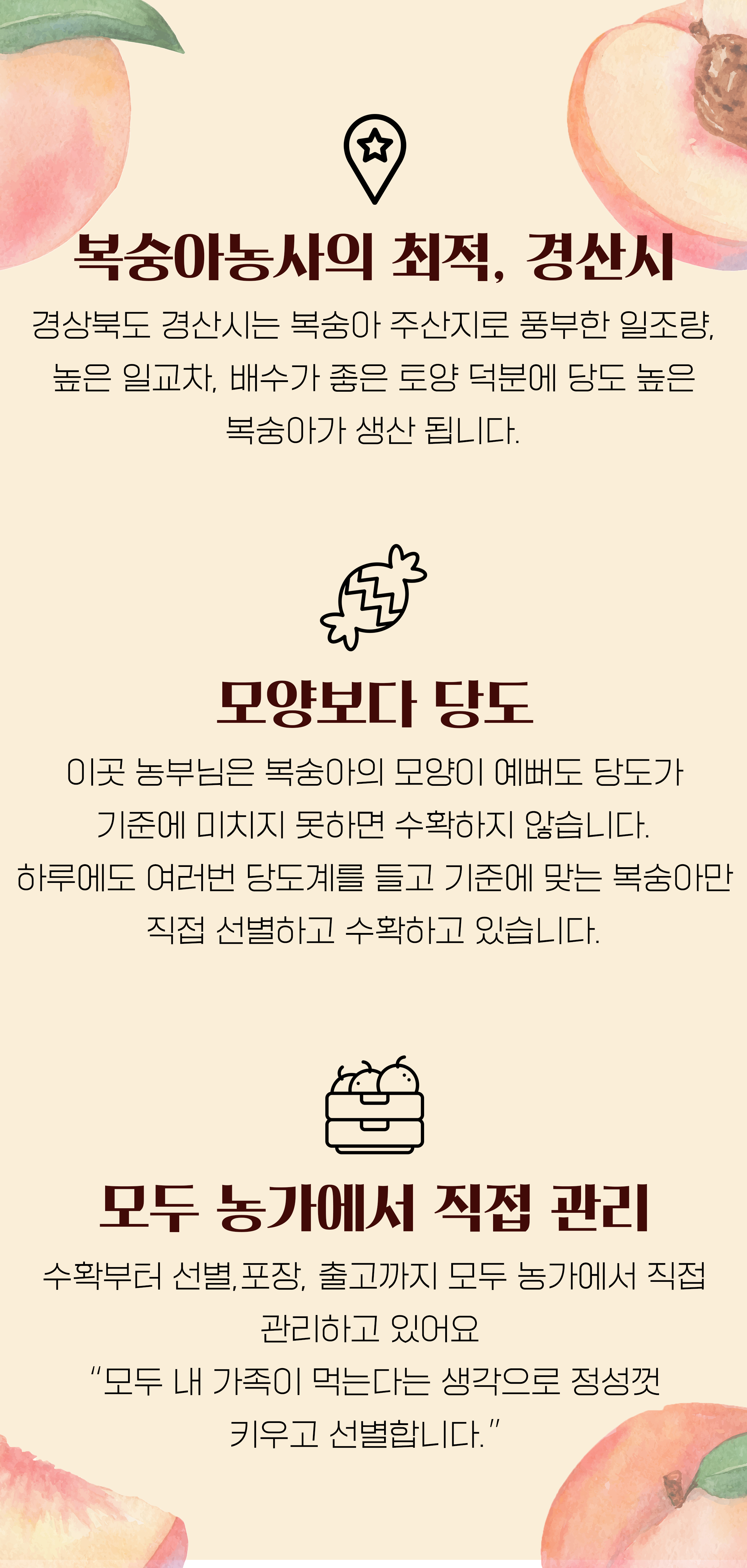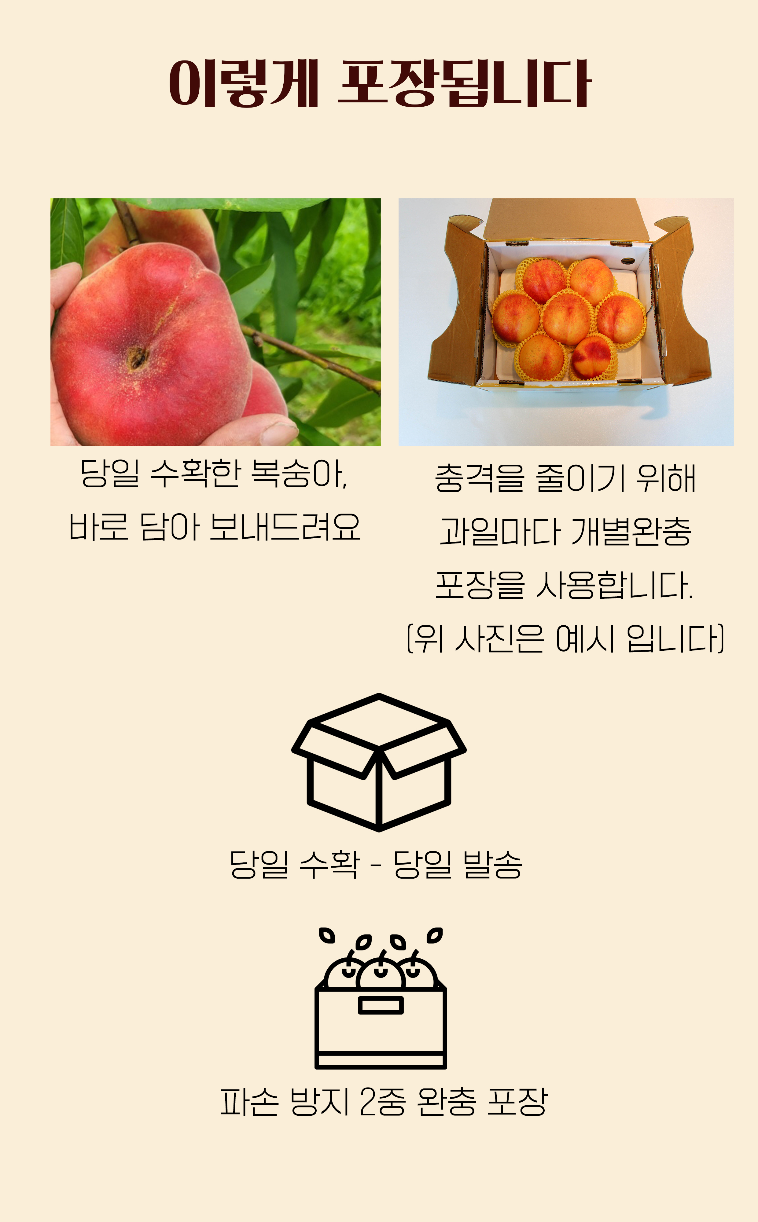 - 보관 방법 : 받으신 후 즉시 복숭아 상태 확인 후 습하지 않고 서늘한 곳에서 1~2일 후숙 하신 뒤 최대한 빠르게 드셔주세요 부득이하게 보관 하실때는 개별로 냉장보관 하되 일주일을 넘지 말아 주세요.