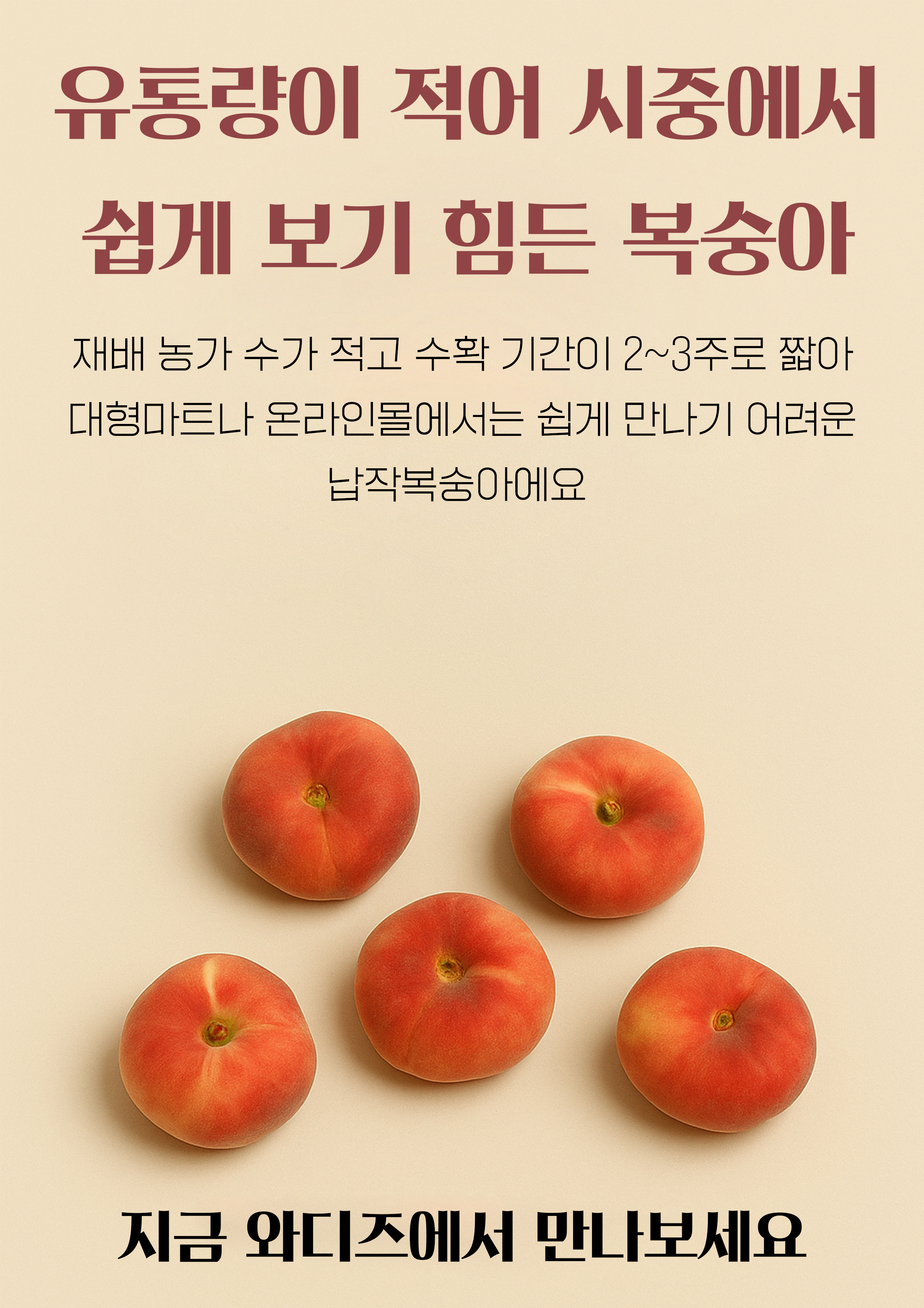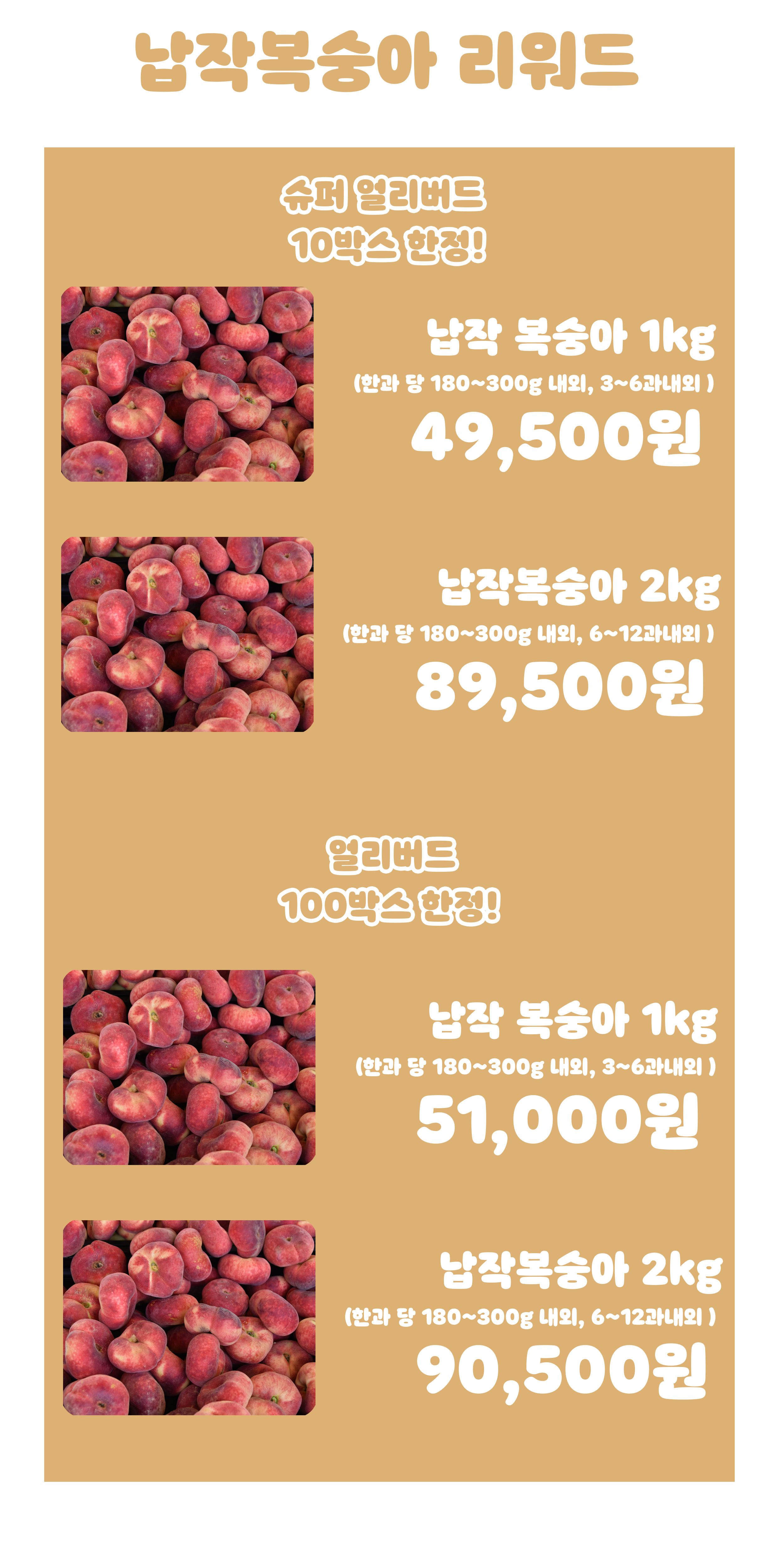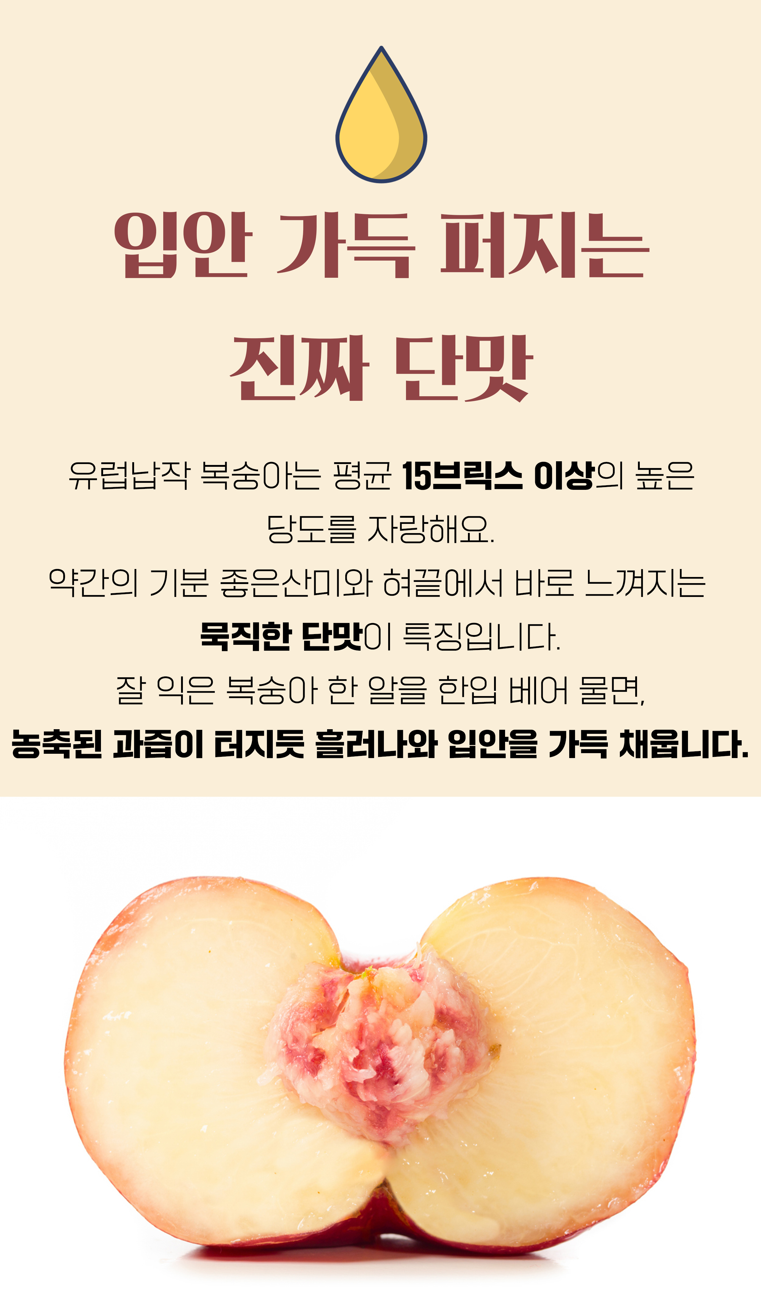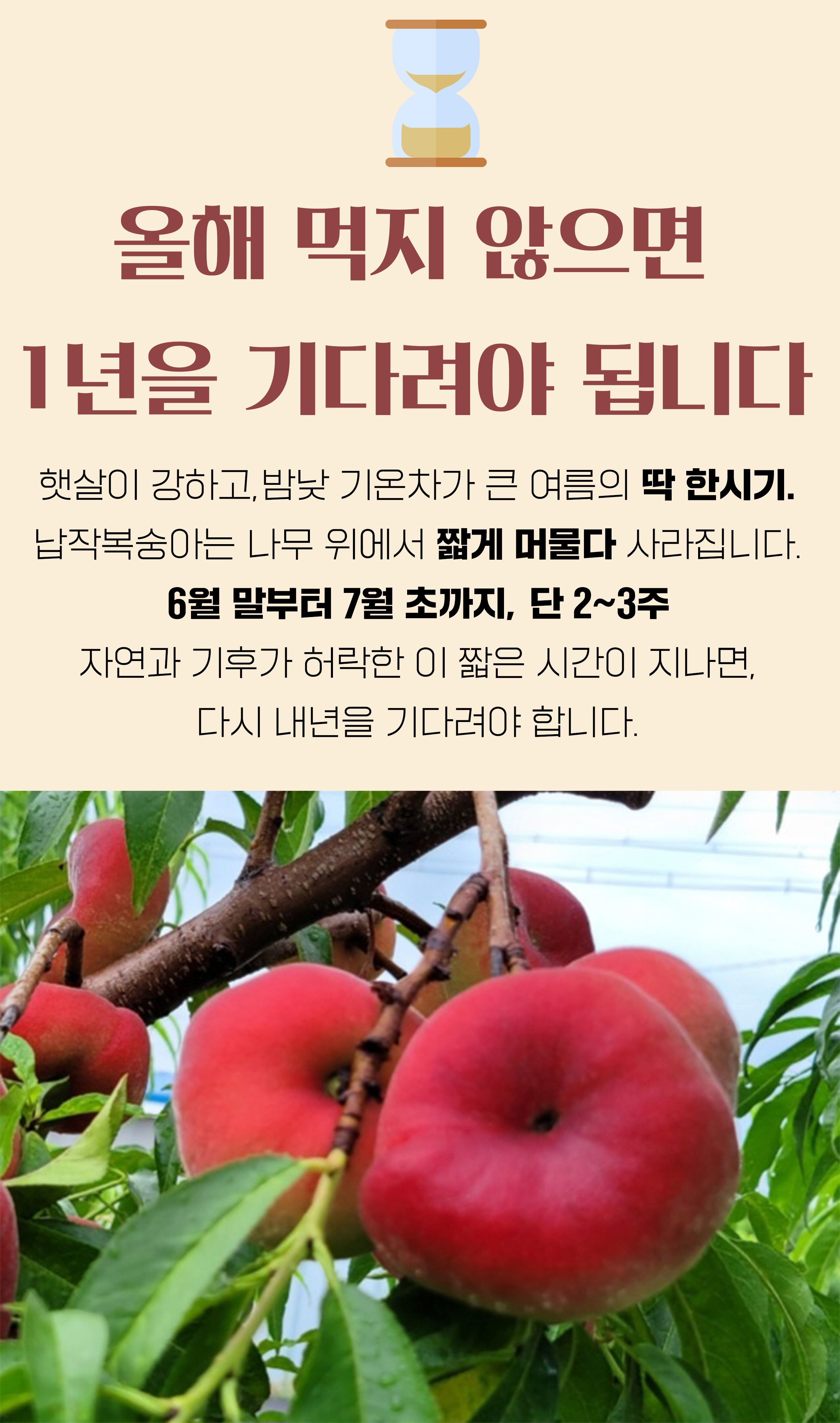 - 보관 방법 : 받으신 후 즉시 복숭아 상태 확인 후 습하지 않고 서늘한 곳에서 1~2일 후숙 하신 뒤 최대한 빠르게 드셔주세요 부득이하게 보관 하실때는 개별로 냉장보관 하되 일주일을 넘지 말아 주세요.