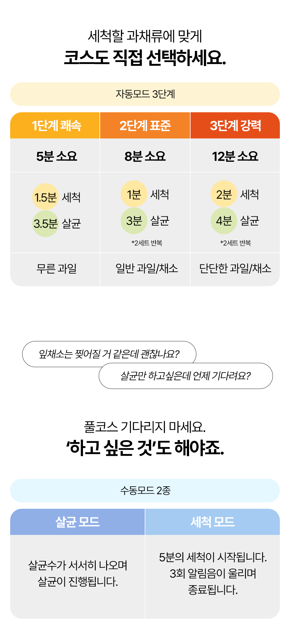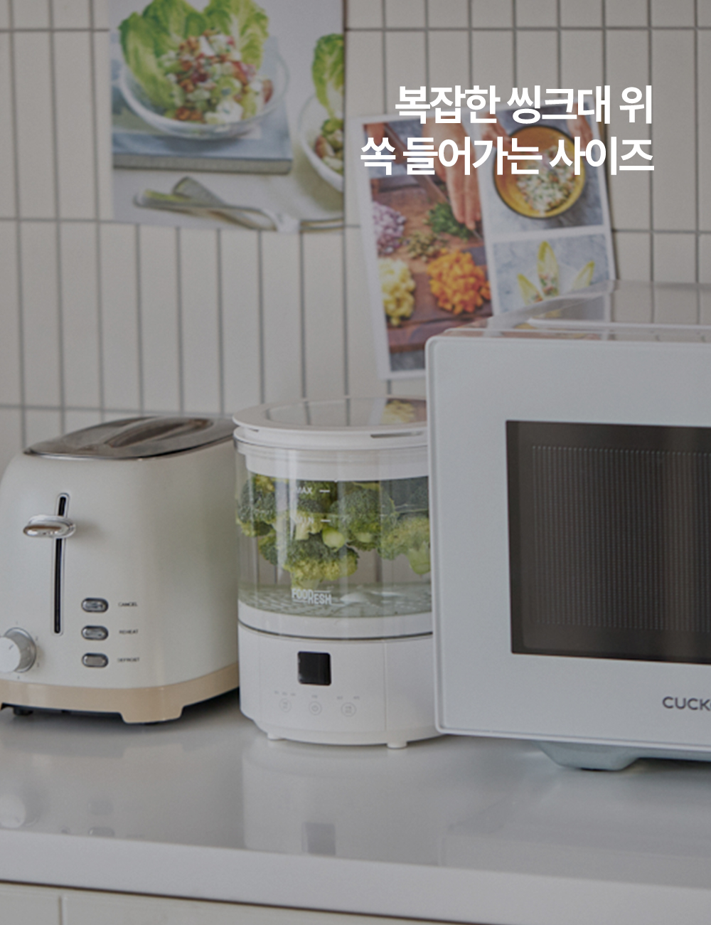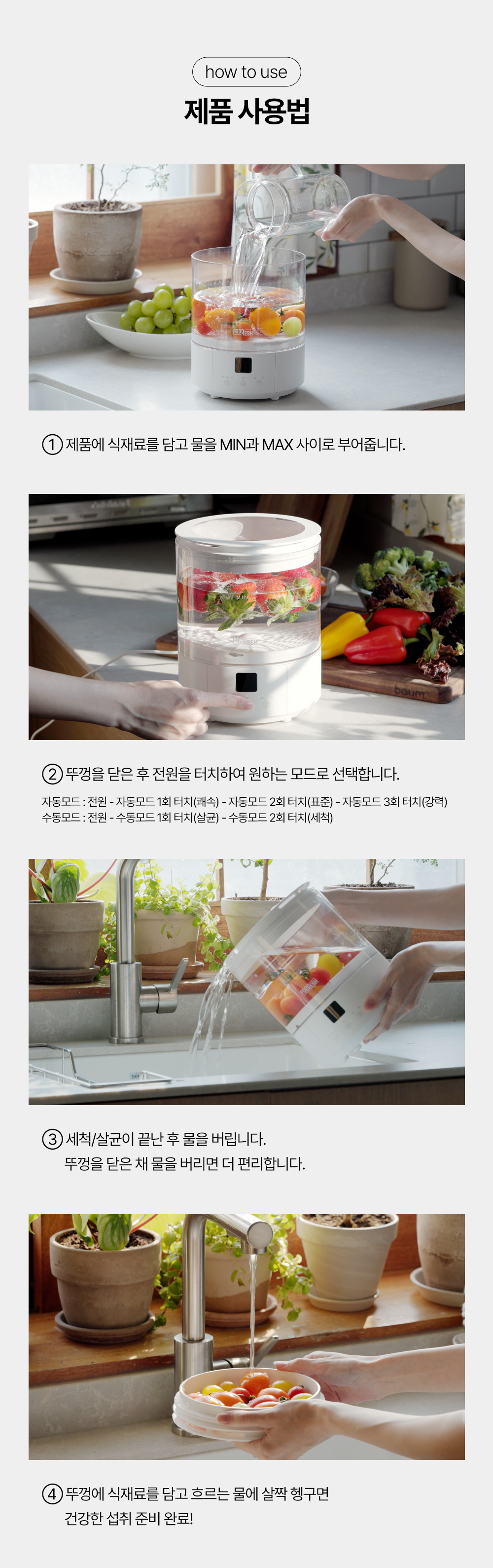 음식이 닿는 모든 곳에 신선함을 주기 위해, 그리고 신선함 뿐만 아니라 우리가 모르고 있었던 세균으로부터 음식을 지키기 위해 '과일세탁기'로 다시 돌아왔습니다.