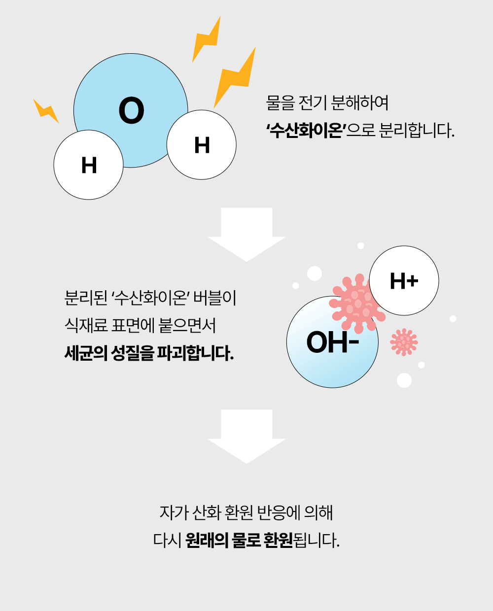 식재료 표면의 박테리아, 잔류농약 등 유해물질을 효과적으로 분해할 수 있어요.