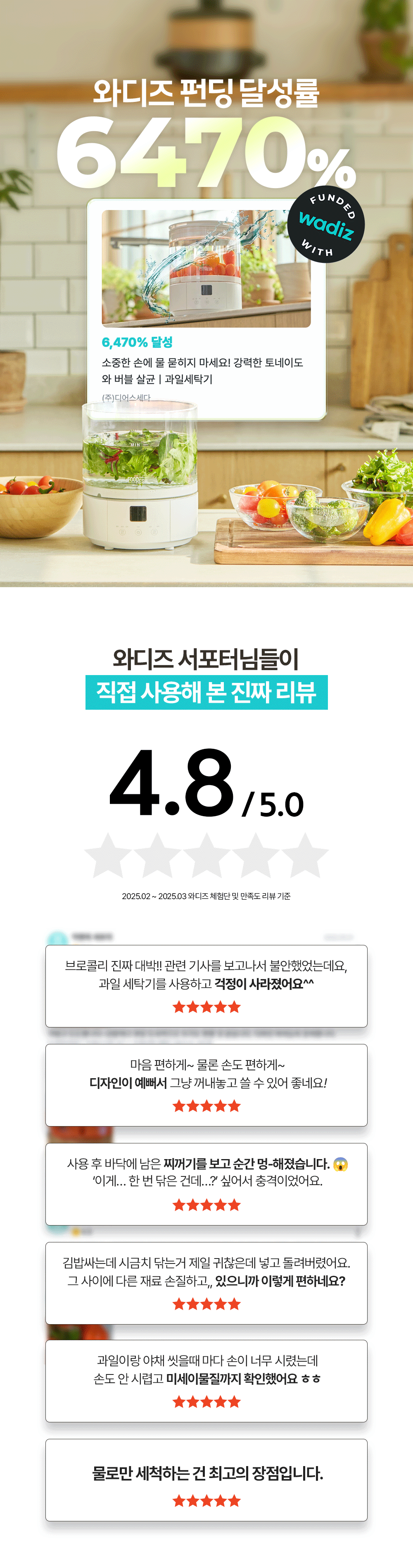 더워지는 날씨, 비싼 과일야채. 이왕 먹는거 확실하고 건강하게 섭취하면 더 좋을 것 같다는 생각으로 시기적절하게 와디즈로 다시 찾아왔습니다. 할 것도 많은데 귀찮은 과일 야채 챙겨먹기, 과일세탁기에 잠시 맡겨보시길 바랍니다. 펀딩금은 더 나은 과일세탁기의 연구를 위해 사용할 예정입니다 :-)