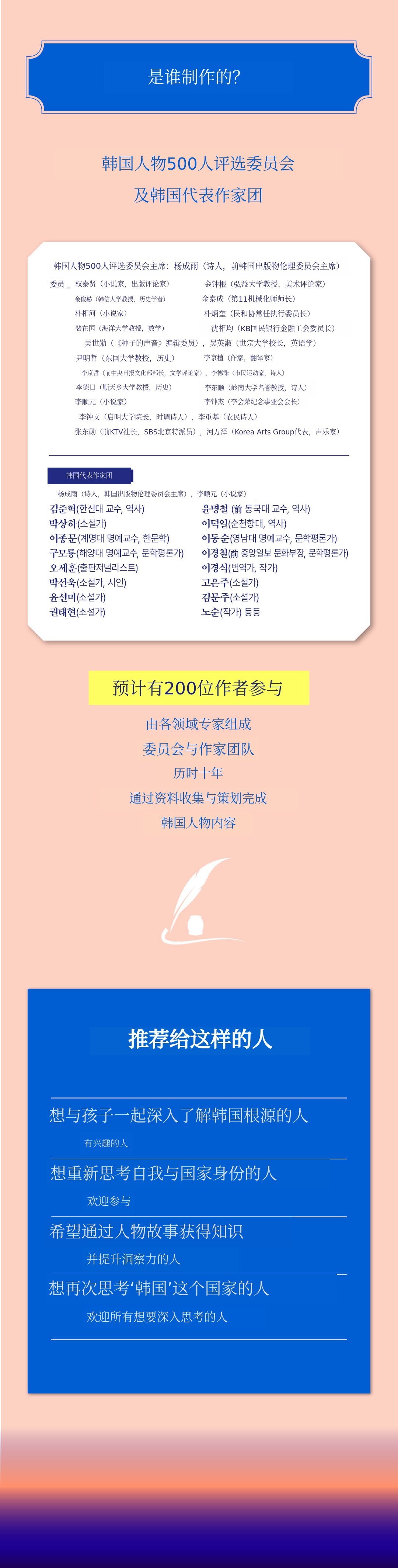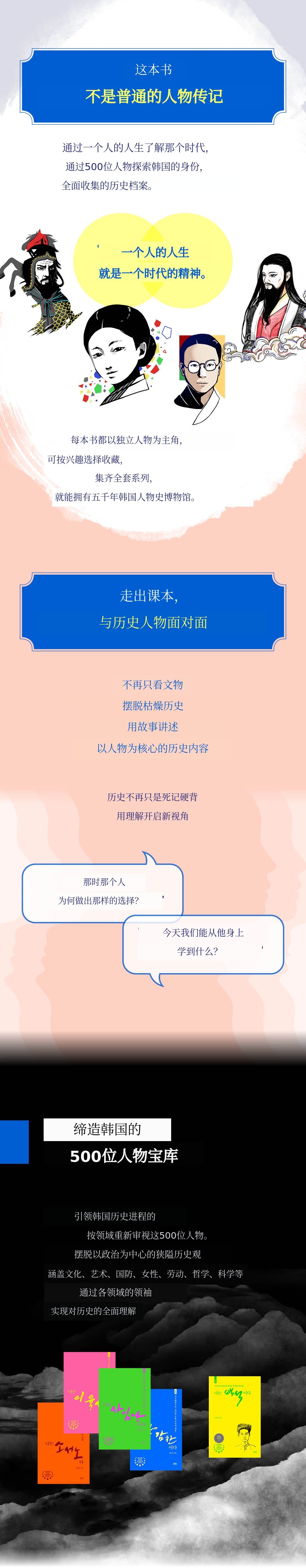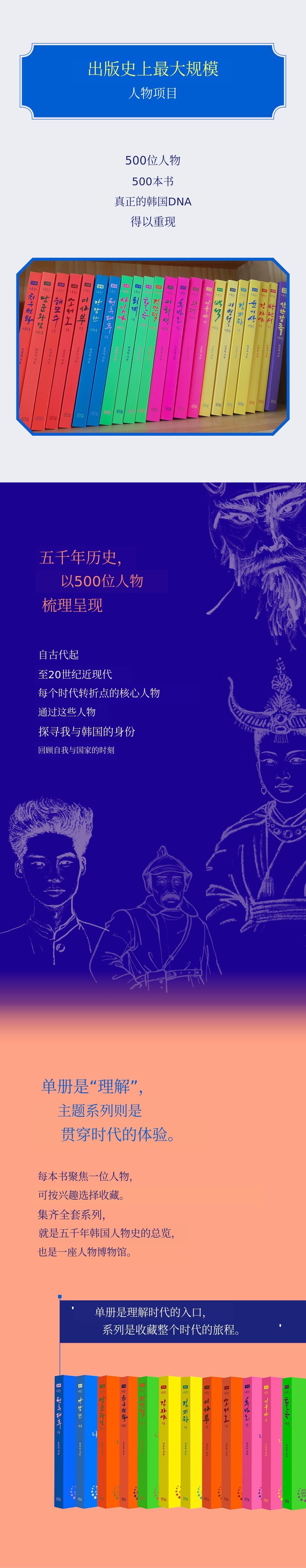 我认为大韩民国的形成过程始于自古以来提升韩民族地位的先祖。我们计划制作能够再次给予当代人勇气的传记形式《韩国人物500》丛书。恳请各位支持者多多关注与支持。谢谢。