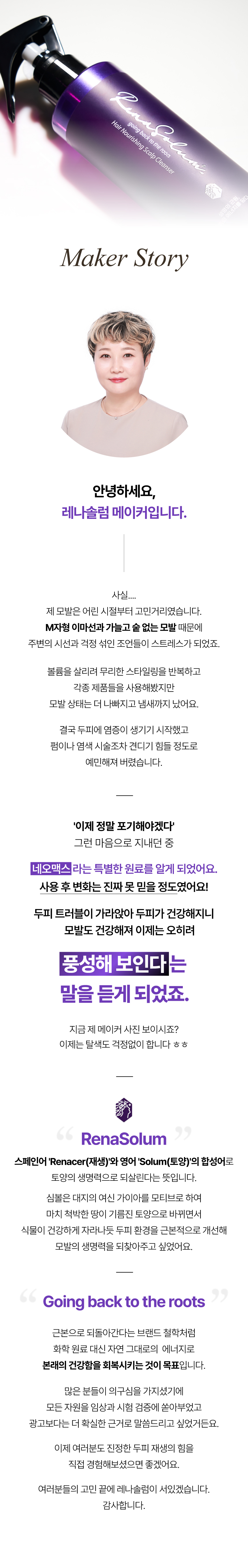 단순히 ‘샴푸’가 아닌,두피와 모발의 근본 원인을 해결하는 새로운 솔루션을 기다려온 분들께 레나솔럼이 제대로 된 대안을 제시할 수 있도록 여러분의 응원이 필요합니다.