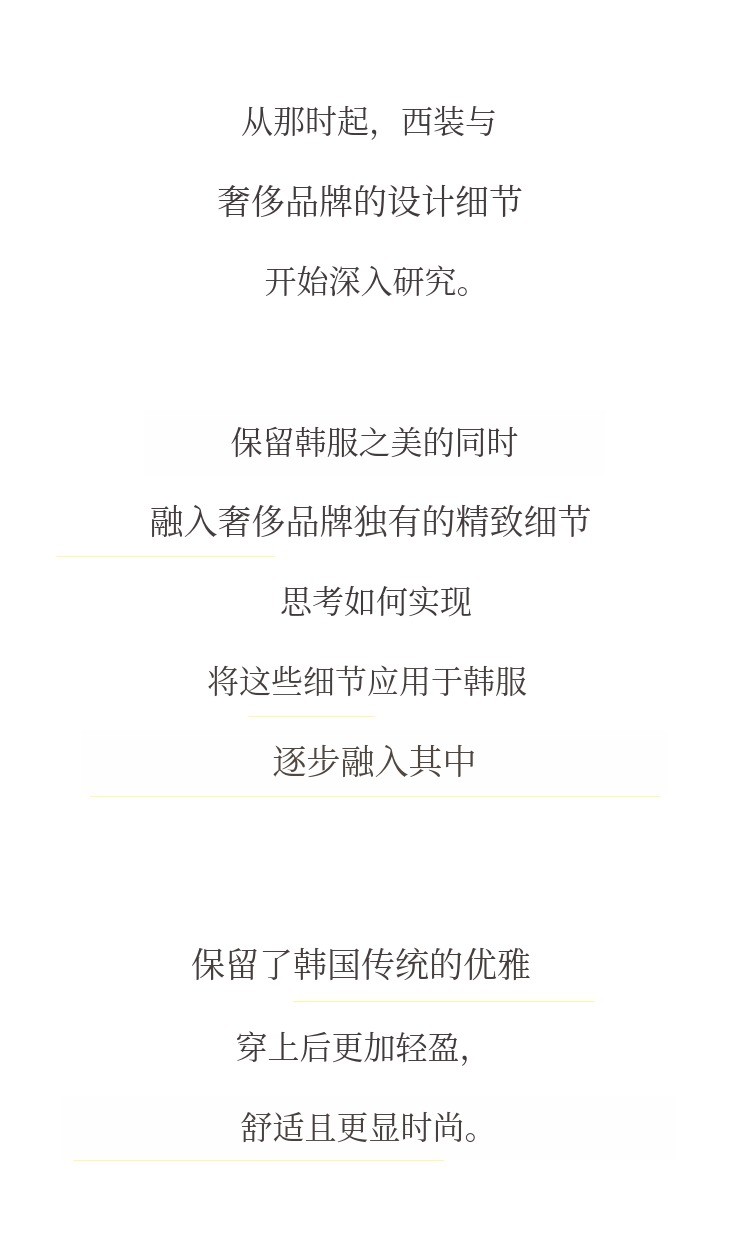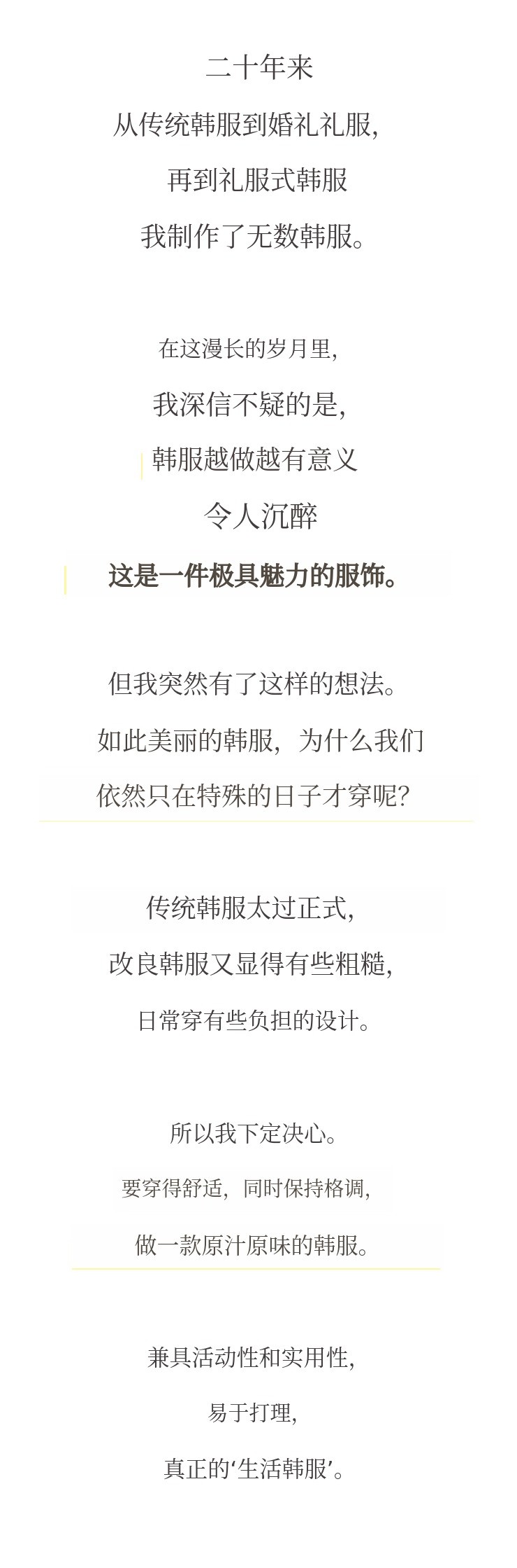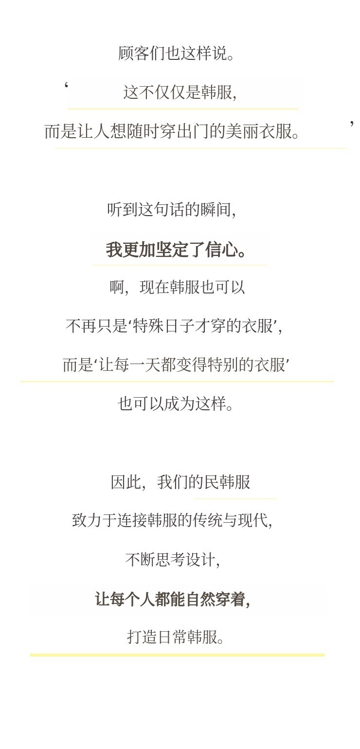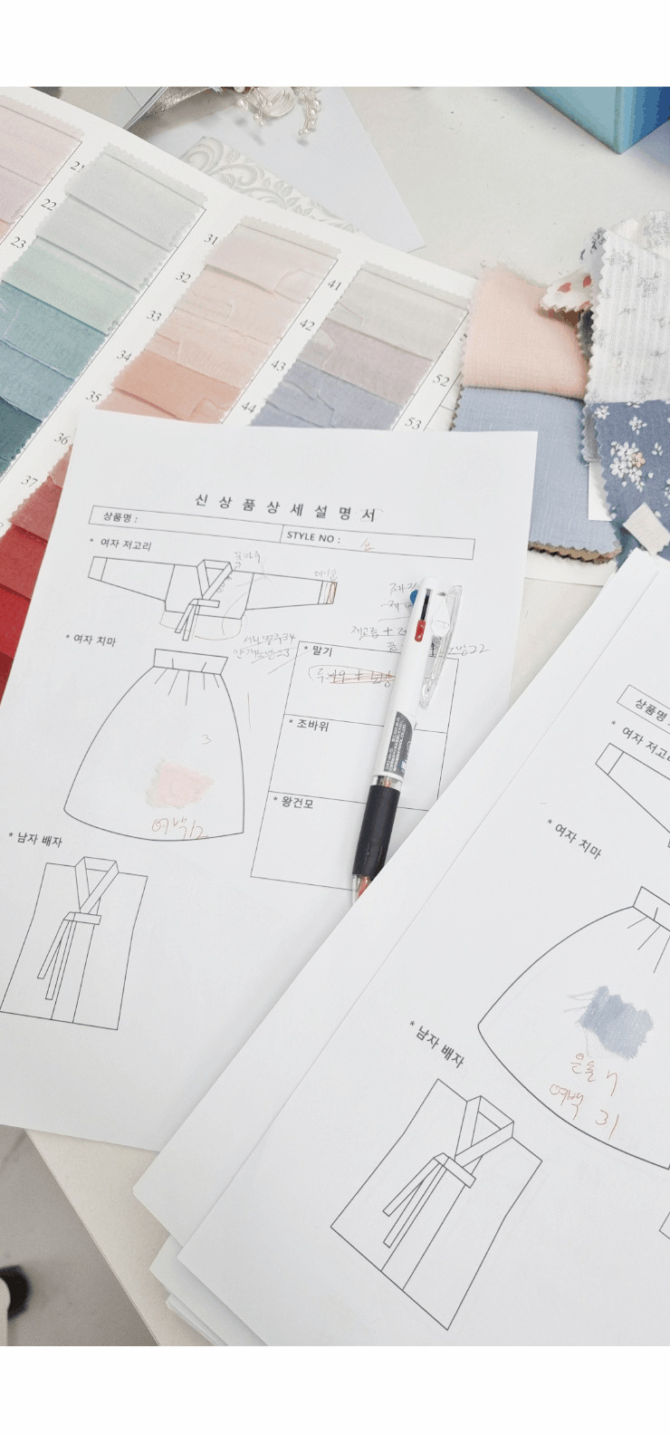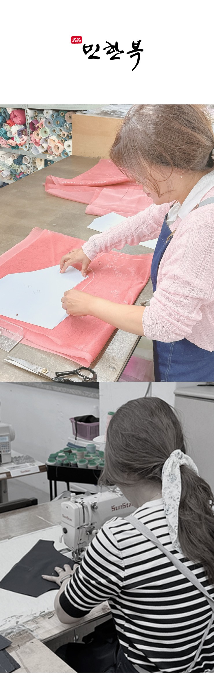 因为对韩服的热爱,二十年来一直与针线和布料为伴。最初学习韩服不是因为有人教,而是单纯地想要制作。刚开始连缝纫都不熟练,选布也很困难,但凭着这份心意,每天做一套,用手慢慢熟悉。二十年过去了。制作、修改、试穿、再制作,如今韩服已自然融入我的指尖。传统韩服带来的庄重感,生活韩服的自由感,儿童韩服的纯真,这些对我来说都不是衣服,而是‘故事’。 无论哪个季节都能舒适穿着,让穿的人更加闪耀。为了制作这样的韩服,今天也在摸布料、穿针引线、挑选丝线。在这漫长的时光里,顾客们分享的每一个故事都成为了我们服装的基础。