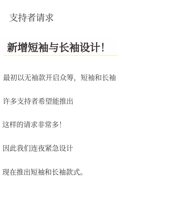 因支持者自身原因导致回报部分或全部丢失/损坏/故障/污染/毁损的情况,由于显示器分辨率差异导致的色差,支持者对产品了解不充分而引发的问题,服装尺寸误差在2cm以内,因产品包装导致的褶皱及线头