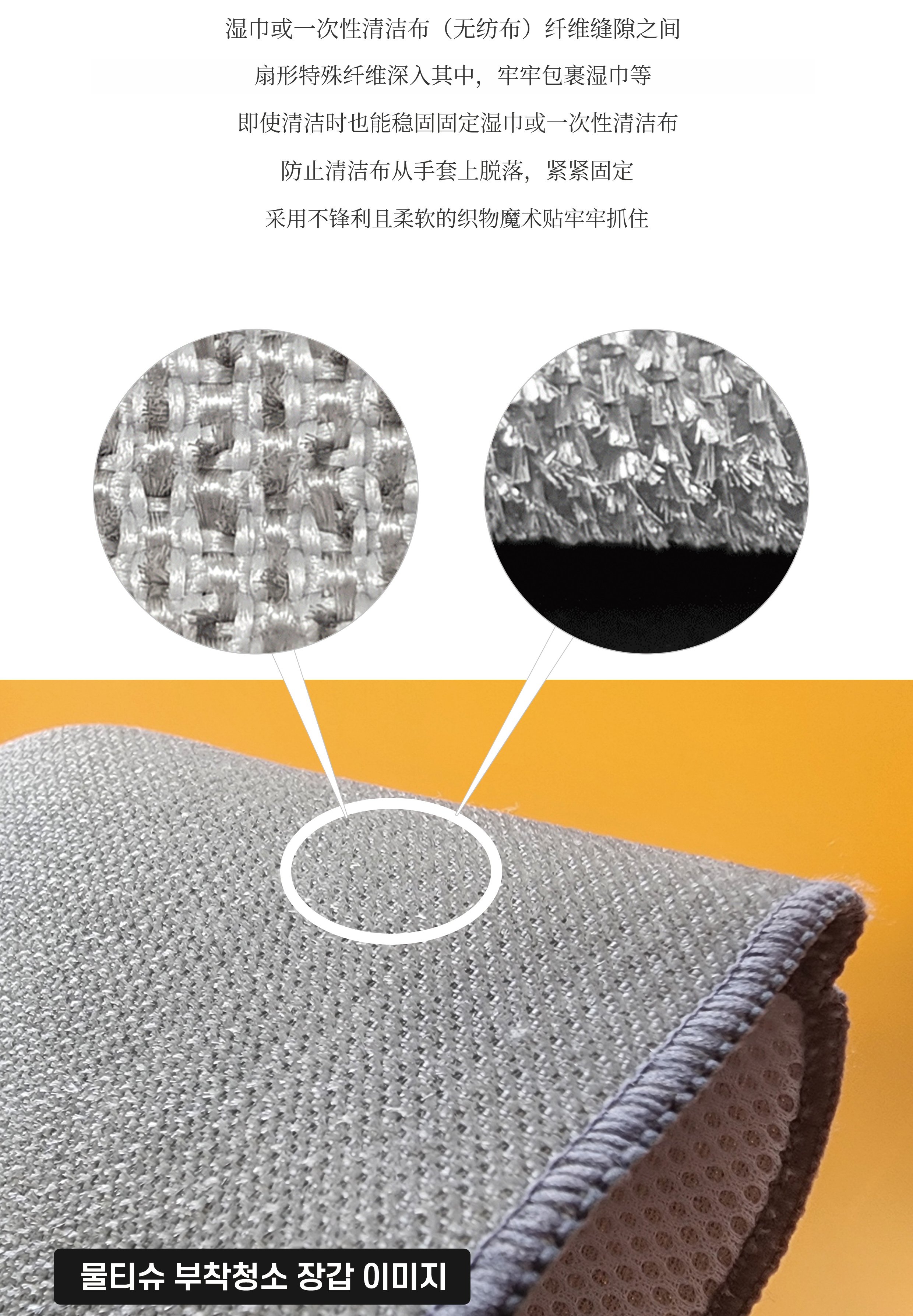采用柔软的织物面料,即使将清洁布或无纺布附着在手套上进行清洁时,也不易脱落或撕裂,并且可以安全使用,无需担心对清洁表面造成划痕或损伤。 此外,得益于织物材质特有的柔韧性和耐久性,成为开发专用湿巾附着清洁手套的最佳技术基础。