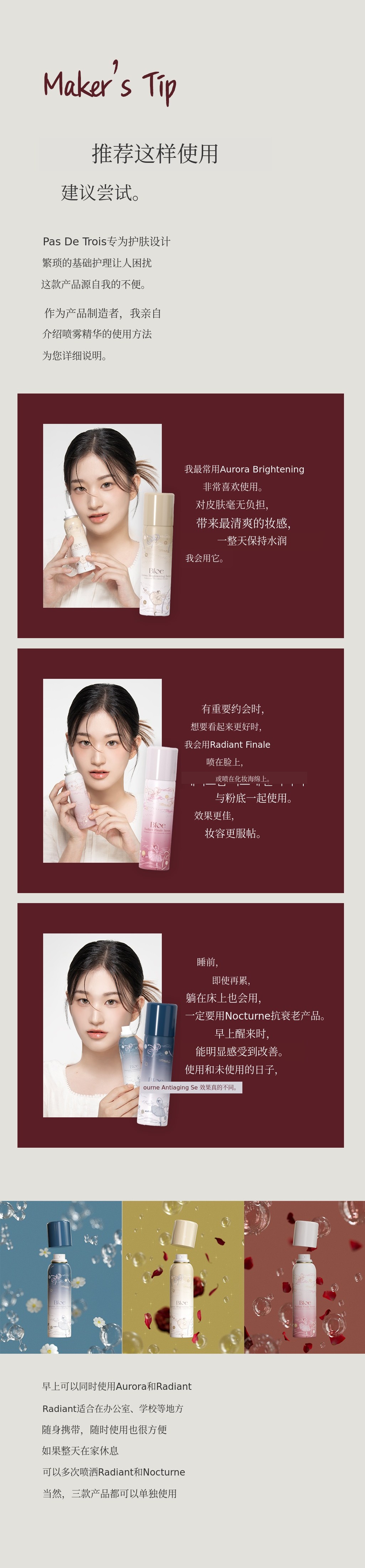 A4. “Pas De Trois”喷雾无粘腻感和泛白现象,即使妆前使用也不会搓泥,使用感清爽。Radiant Finale在妆前使用时可提升协同效果。