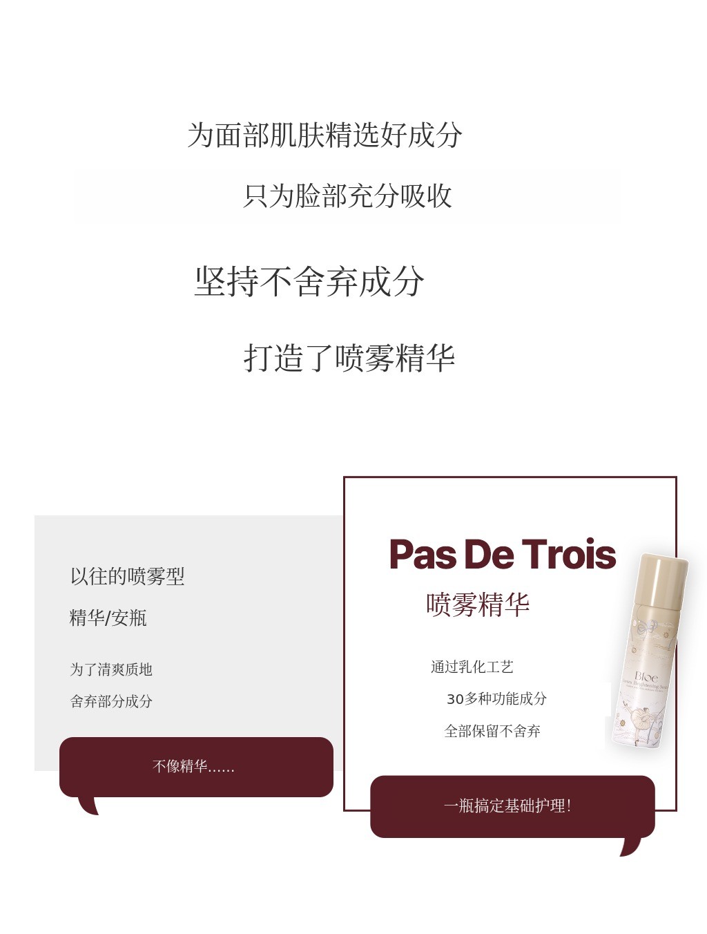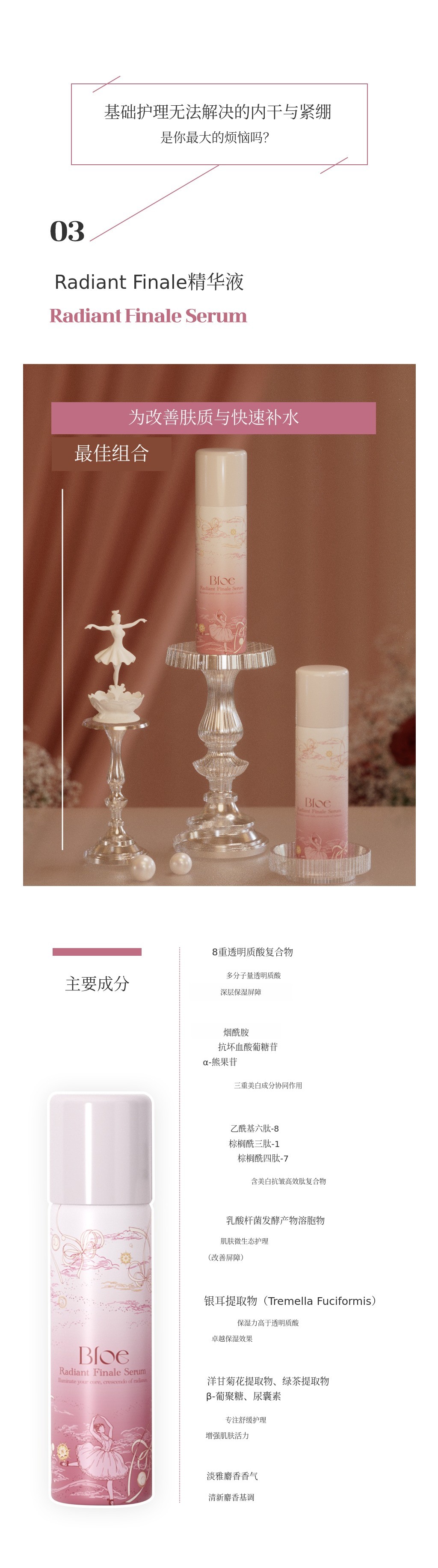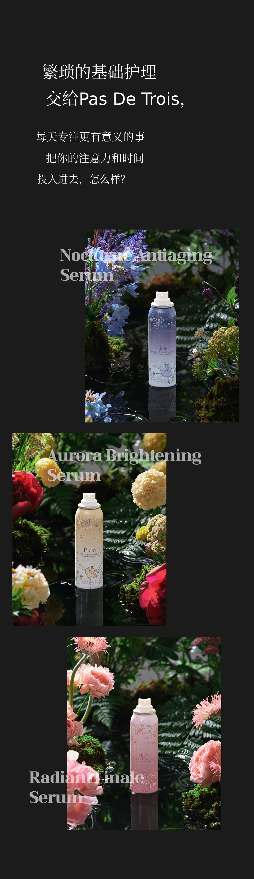 Bloe是一款融合感性与艺术的高端美妆品牌,致力于开发最大化肌肤本真之美的创新护肤产品。本次“Pas De Trois”系列意为“三位舞者和谐共舞”,以芭蕾的优雅与和谐为灵感,将美白、补水舒缓、胶原护理三大功效相结合,打造出协同增效的三步定制全能解决方案。