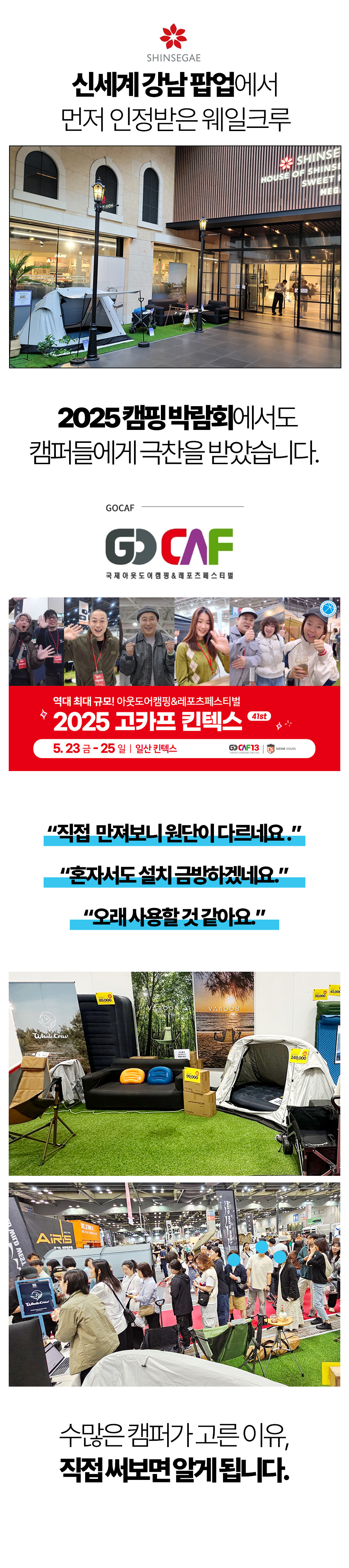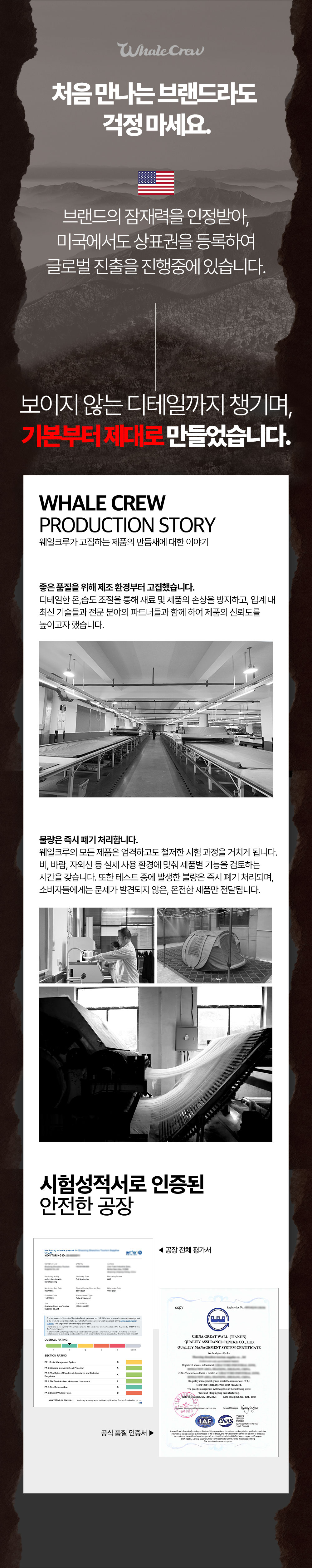 익숙하지 않은 브랜드라 조금은 고민 되셨죠? 웨일크루는 미국 캠핑 라이프스타일에서 영감받아 시작된 브랜드로, 한국 론칭을 거쳐 미국 진출을 준비 중입니다.