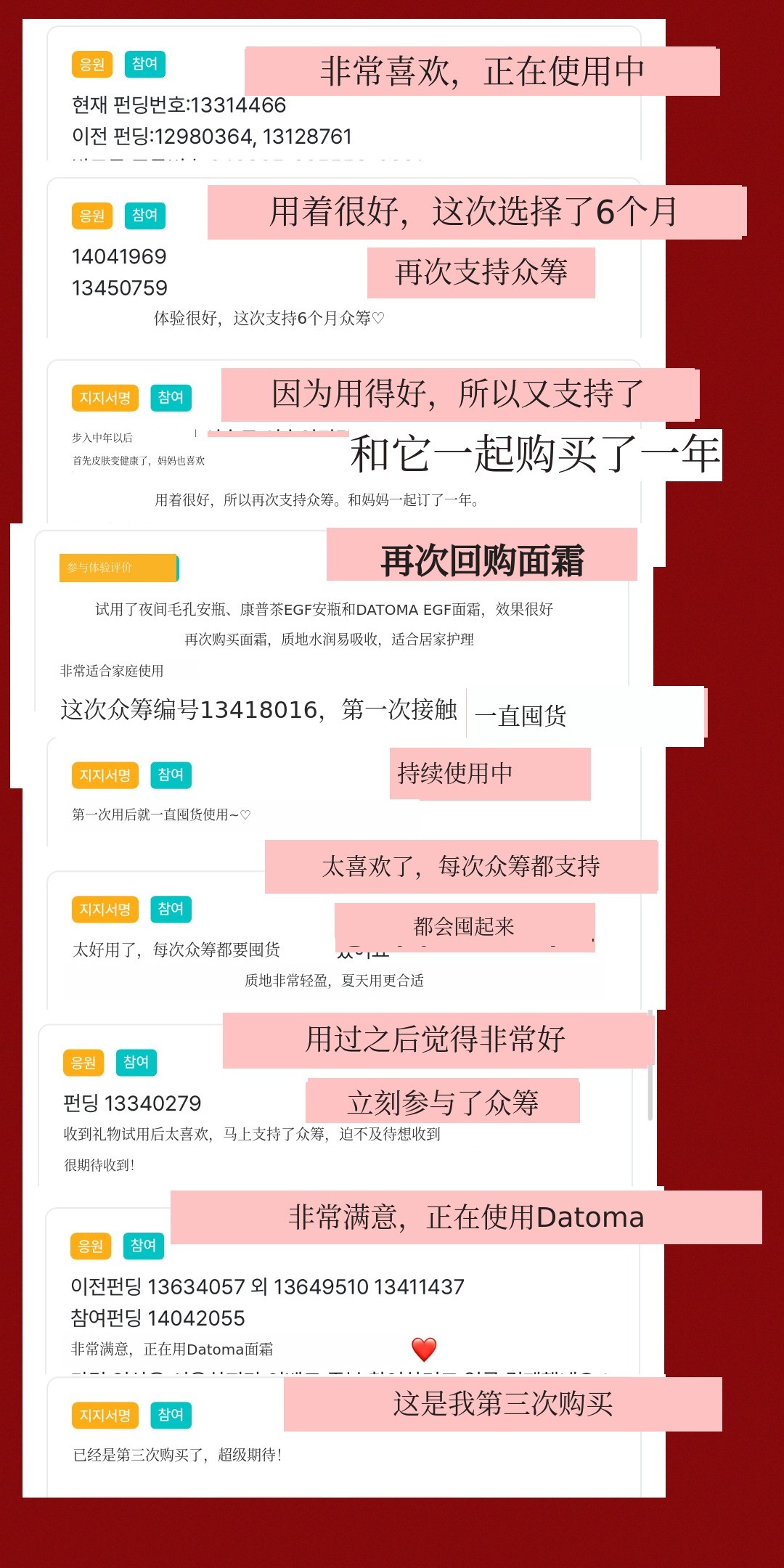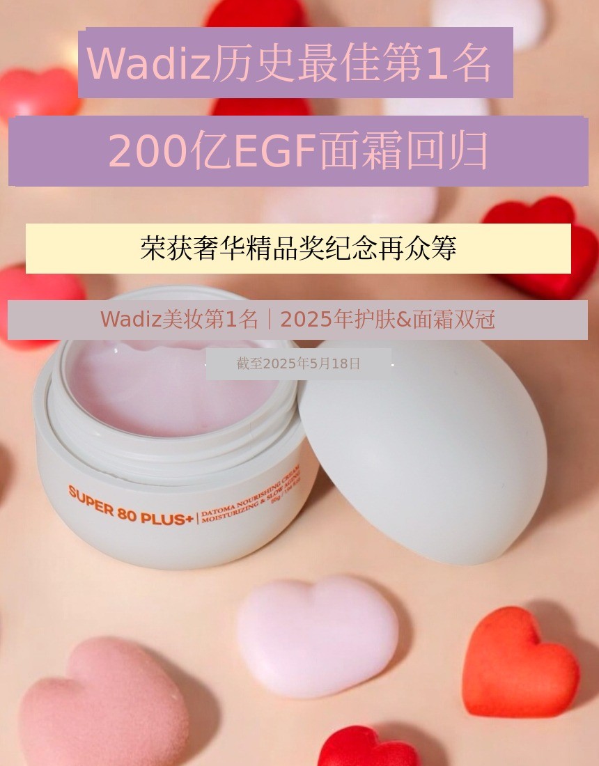 1. 🧴 无纯净水的高端EGF面霜 - 含99.9%纯度活性EGF及奢华成分,促进皮肤再生与保湿 2. 🌟 Wadiz第一名 累计销售12亿 - 累计销售12亿韩元,2025年护肤品第一名,进行加映众筹 3. 🎁 限量加映众筹福利 - 尊贵名品选定纪念特别折扣及额外赠品