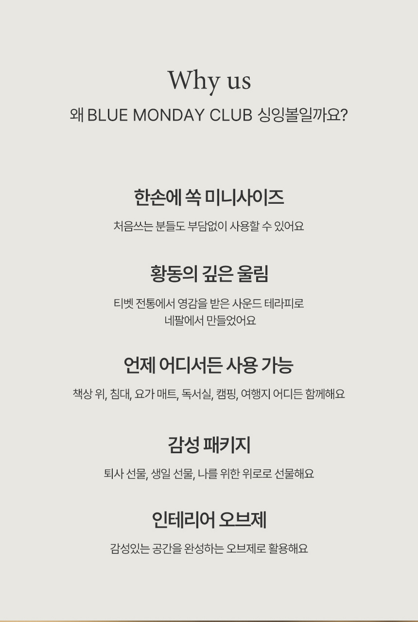 1. 🔔 尼泊尔工匠手工制作颂钵 - 为周一感到压力的成年人提供高品质疗愈品 2. 🧘‍♂️ 简易1分钟冥想流程 - 用声音安抚心灵,传递不孤单的感受 3. 🎁 感性礼品套装 - 可爱包装,适合赠礼