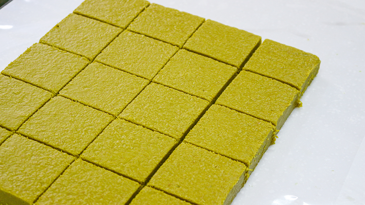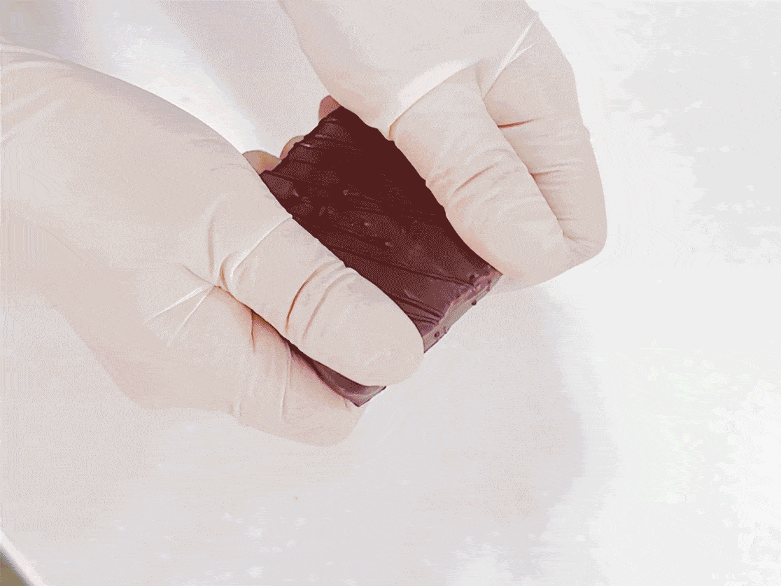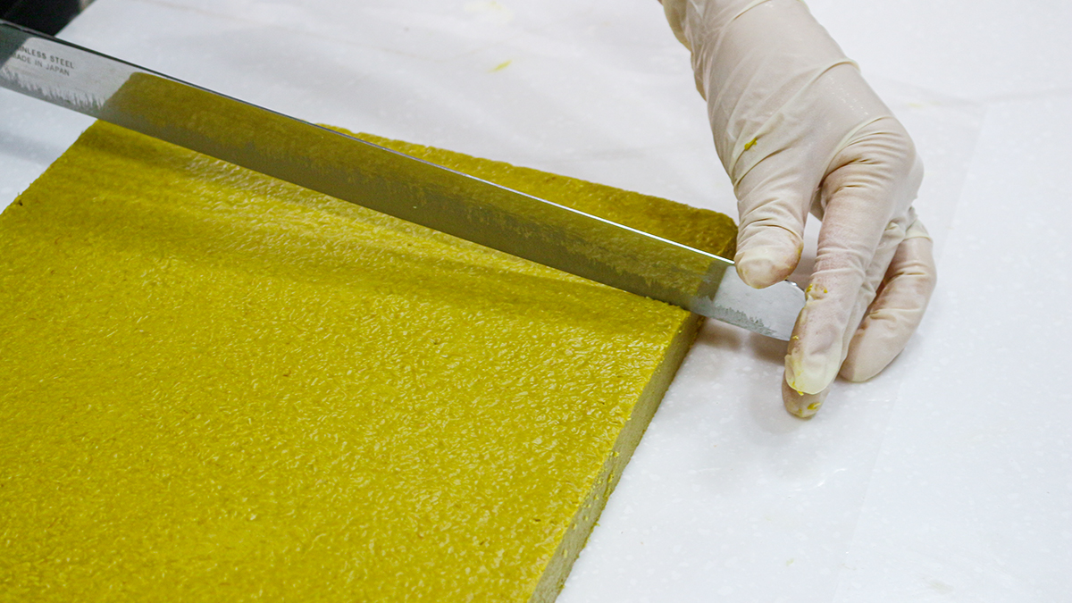 这是为了完成开心果香气与黑巧克力融合最佳的厚度。