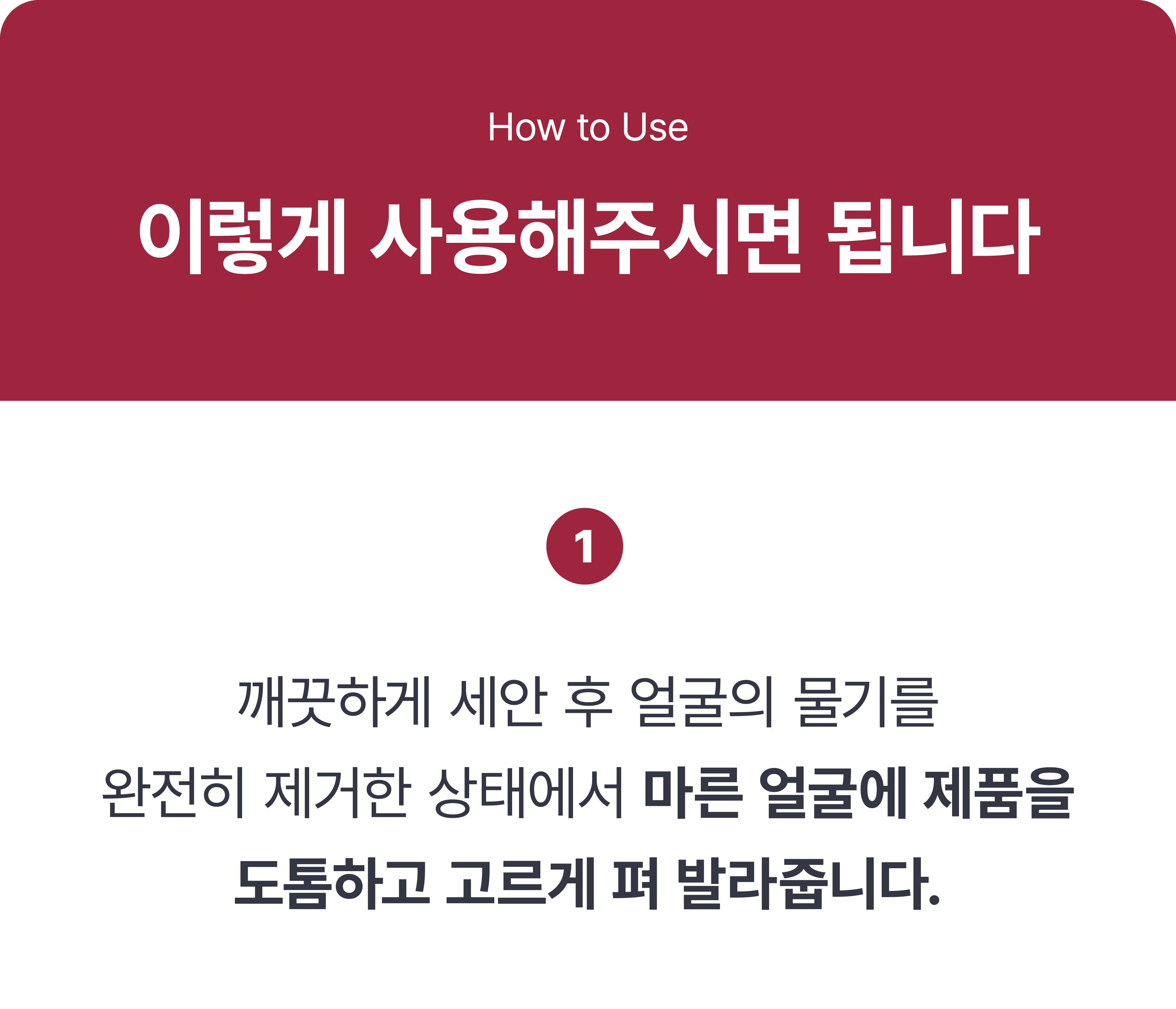 제품의 효과를 극대화하기 위해 반드시 깨끗하게 세안한  얼굴의 물기를 완전히 제거한 마른 상태에서 사용해야 합니다.