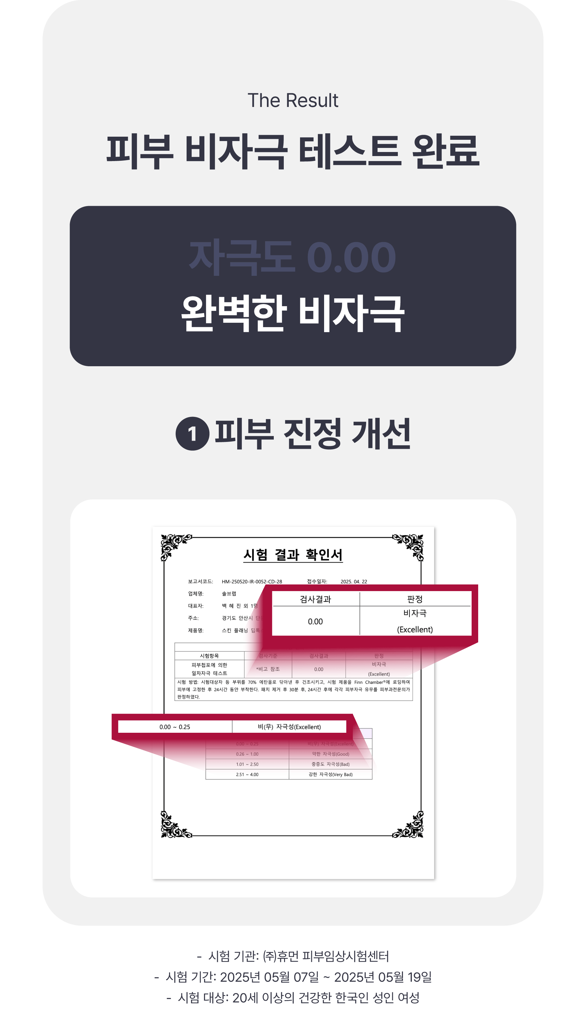 1. 화장품 사용  또는 사용  직사광선에 의하여 사용부위가 붉은반점부어오름 또는 가려움증 등의 이상증상이나 부작용이 있는 경우에는 전문의 등과 상담할