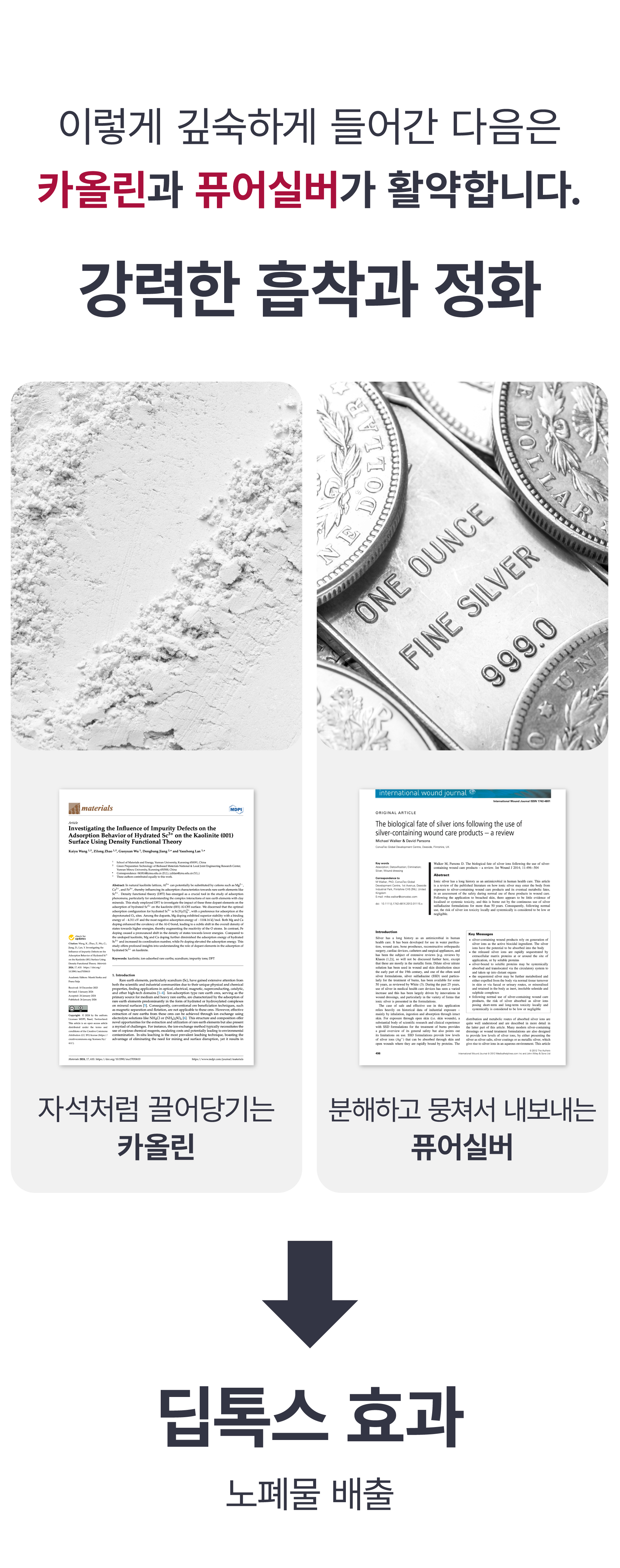 99.9% 퓨어 실버 - 음이온이 피부 표면의 유해균과 오염물질을 분해하고 불활성화 시키며 미세 은 입자가 노폐물과 결합하여 카올린이 더 쉽게 흡착하고 배출할 수 있도록 도움
