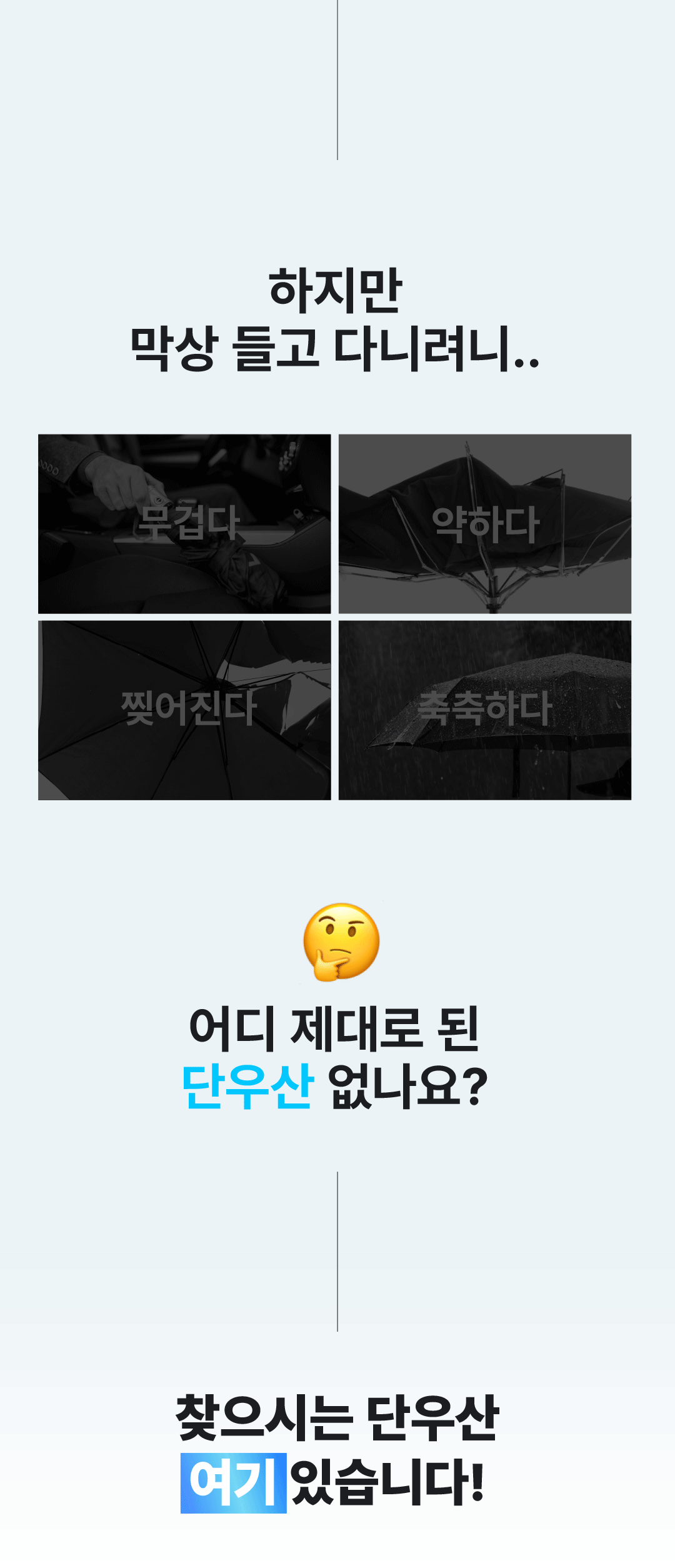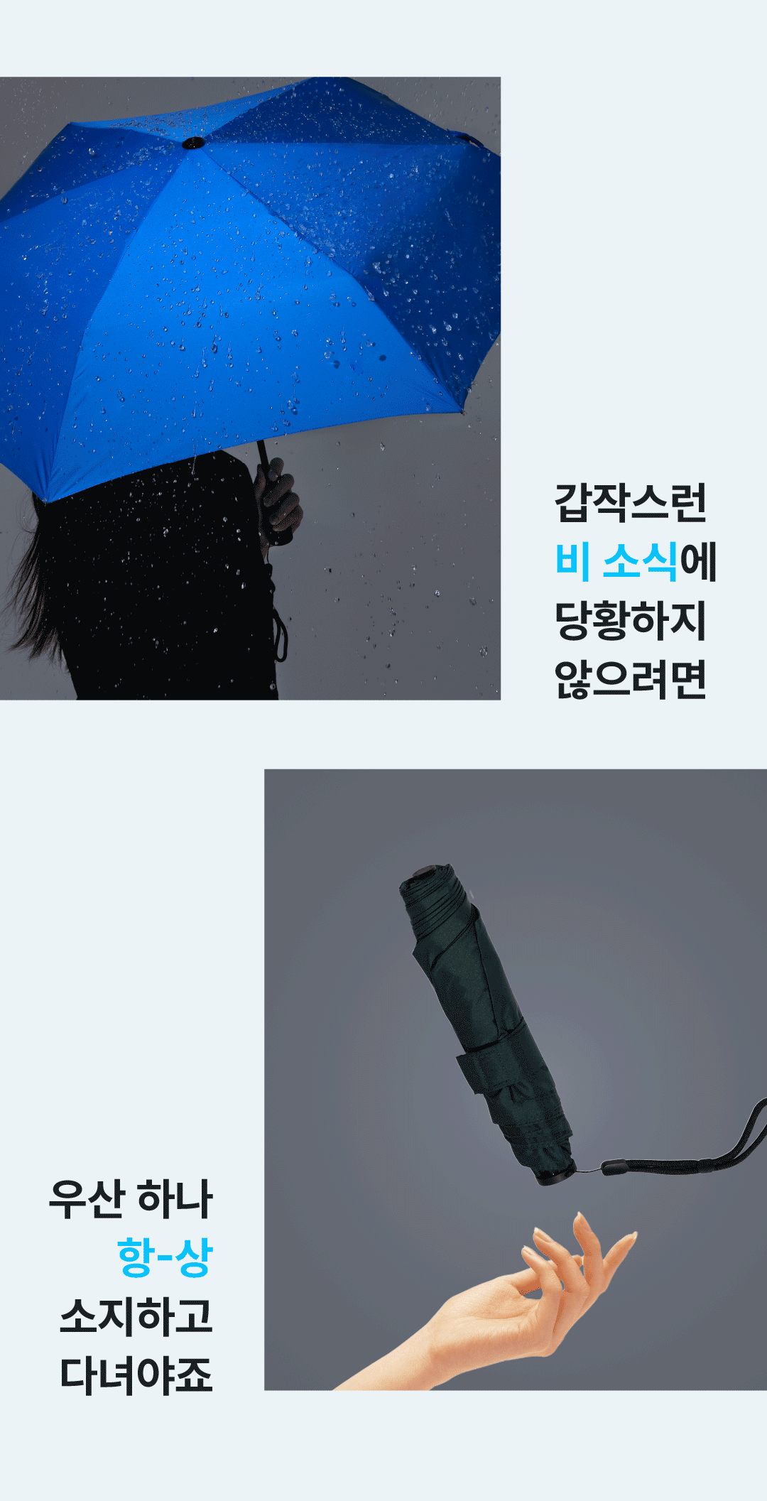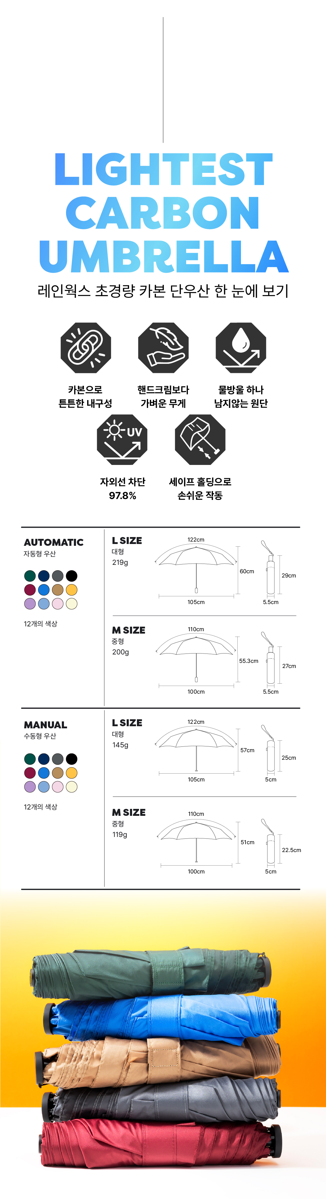 우리나라의 아열대? 기후화로 인해 우산 사용이 빈번해 지고 있습니다. 우산의 무거움과 휴대하기 불편함, 파손, 분리수거의 어려움, 폐기로 인한 환경오염 등을 조금이라도 덜어주는 우산이 되길 바라는 마음에서 풀카본 우산을 선보입니다. 언제나 응원해 주셔서 감사합니다.