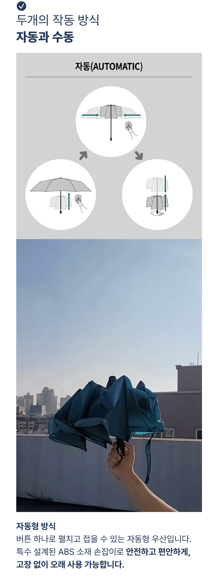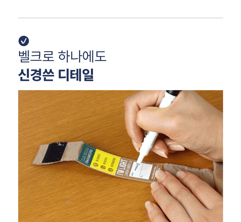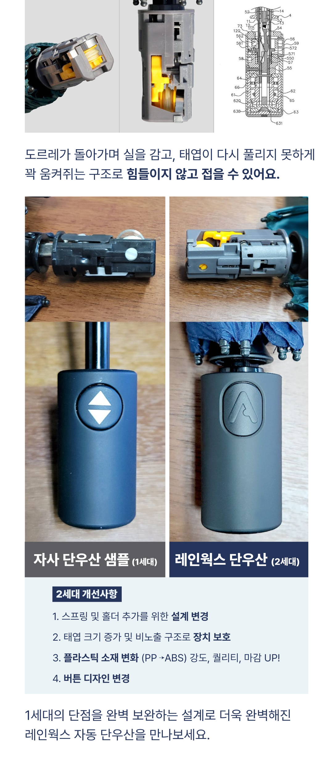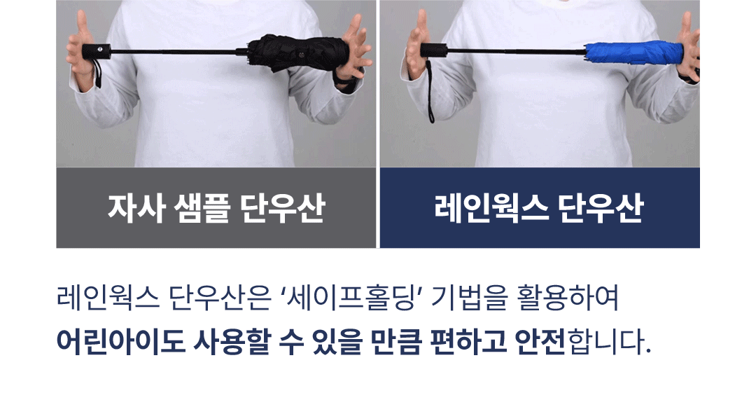저희 자동 단우산은 원단업체(A), 우산살 업체(B), 우산기둥 및 최종조립 업체(C), 손잡이 제작업체(D)에 개별 컨택하여 만들어집니다. 그렇기 때문에 원가 절감으로 인해 동일한 가격으로 보다 품질이 좋은 소재를 공급 받을 수 있습니다. 아울러 A, B, C, D 업체가 서로 알 수 없고, 최종 조립하는 C업체와는 독점 공급 계약으로 진행하기 때문에 시장에 I'M LIGHT 장우산의 카피 제품이 나오기 어렵습니다.