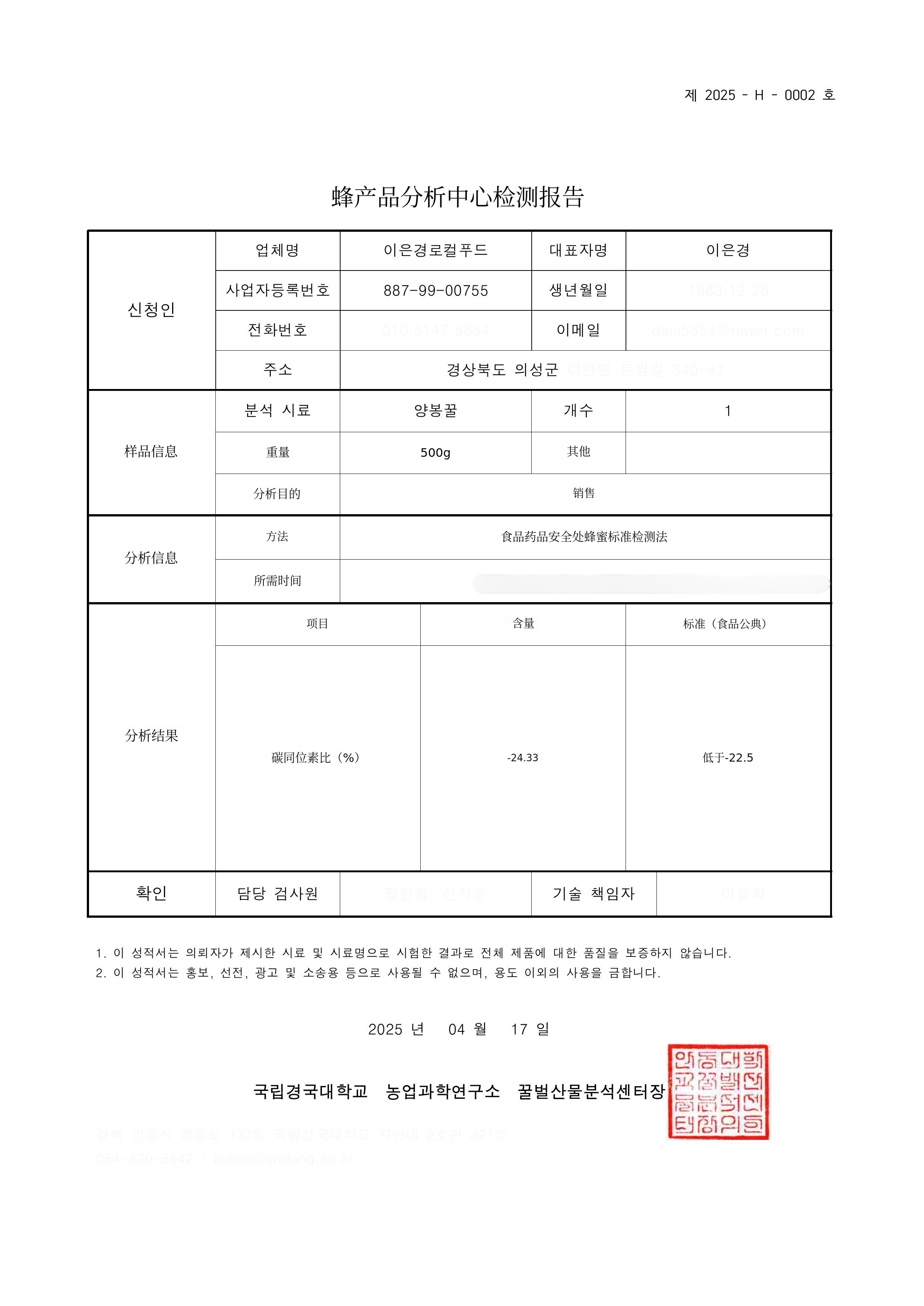 25年检测报告(李恩京熟成蜂蜜碳同位素比 -24.33‰)