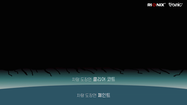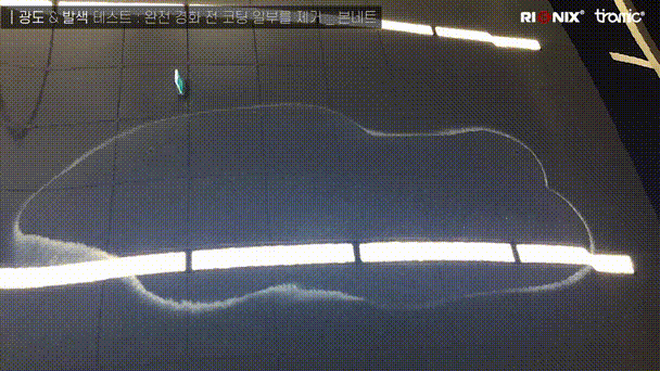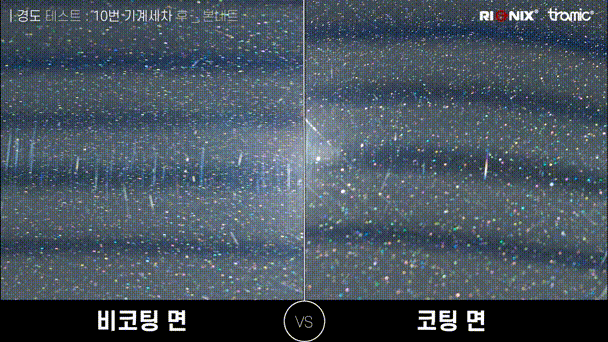 大约一个月后, 透明且坚硬凝固的Tiramic涂层 样子。陶瓷 会渗透到表面的微小针孔[Pinhole],渗入并形成一层涂层,就这样完全固化,变得坚硬地被涂覆。