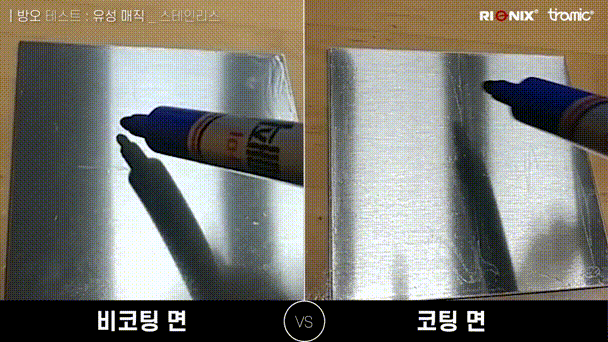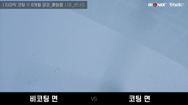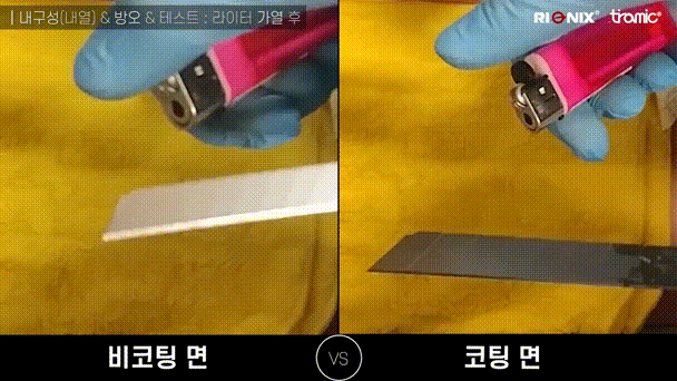 左侧为应用了Rionics涂层技术的金属,右侧为未应用涂层技术的金属。