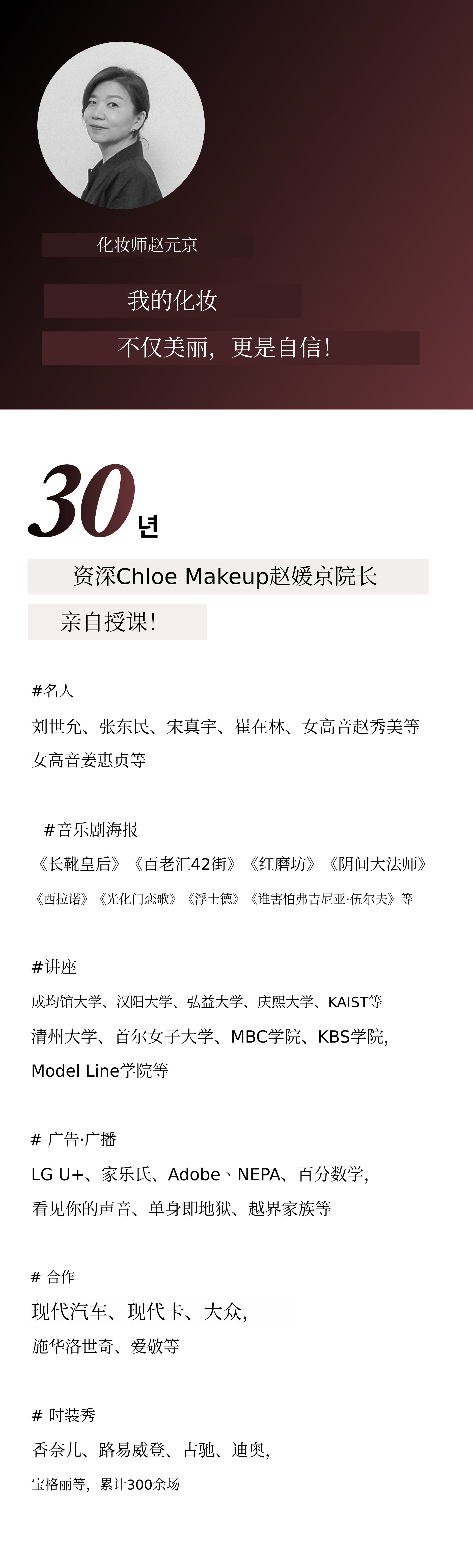 Chloe在过去25年间活跃于奢侈品牌时装秀后台、电视剧、广告、音乐剧等各个领域,是韩国顶级1%清潭本地人和准新娘们一直隐藏的沙龙。