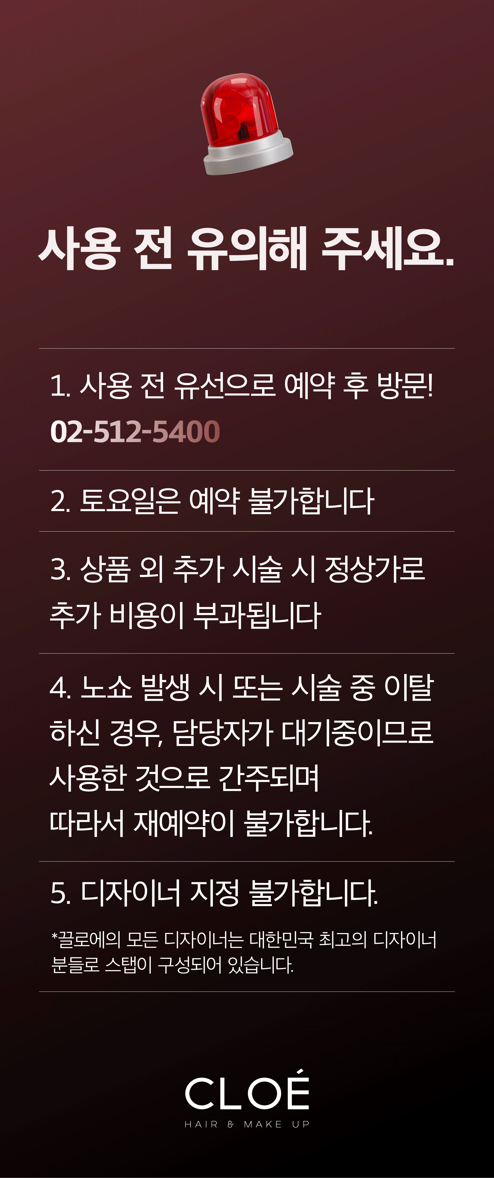 - 当天 及 前一天 预约 更改 & 取消 不可. 当天 预约 变更和 取消 与未到场 相同 克洛伊 清潭 预约券 已用完 视为 请注意 注意 请留意。