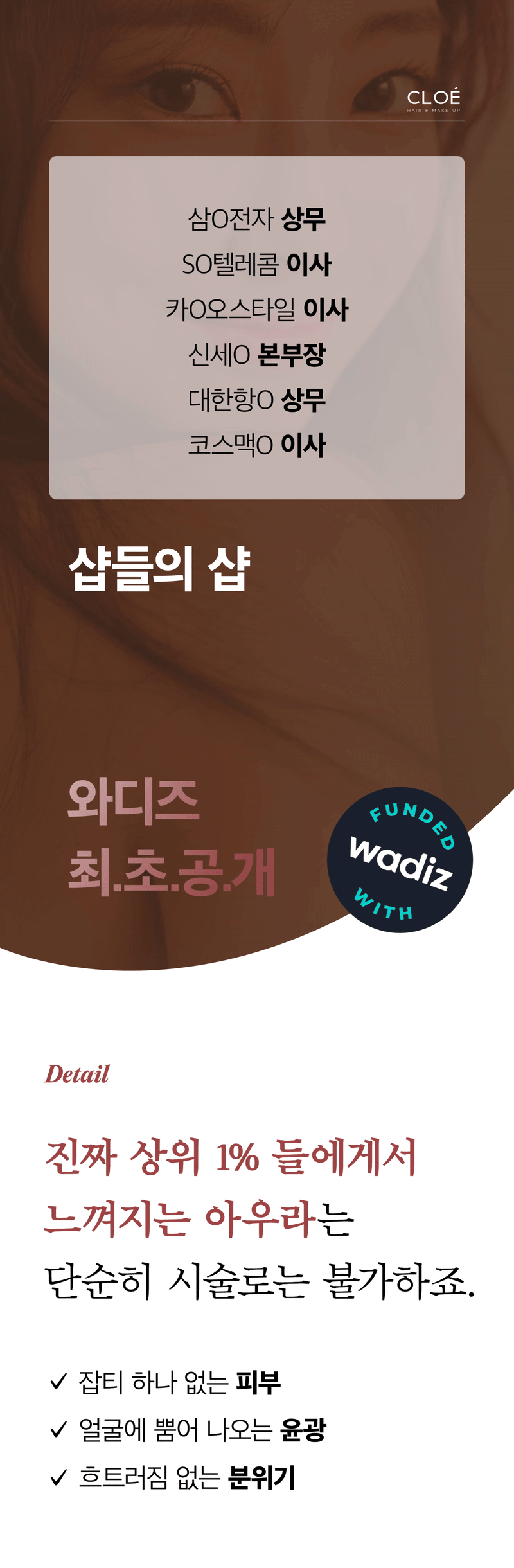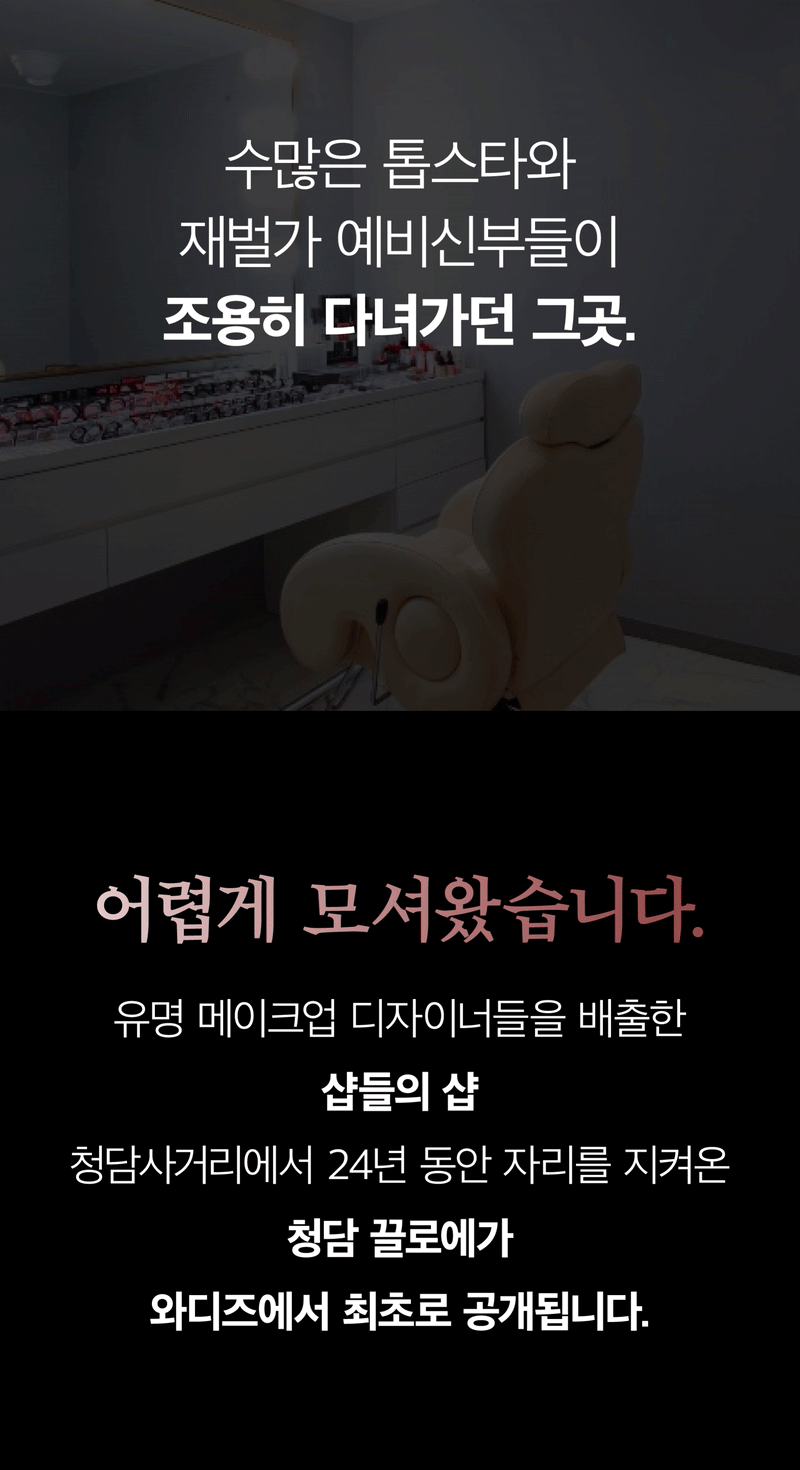 Chloe清潭不仅是修剪头发和化妆的空间,更是唤醒你内在独特美丽的“发现空间”Chloe。与众多名人、新娘以及想要改变自我的无数顾客共同积累的30年秘诀,将首次向Wadiz支持者公开。
