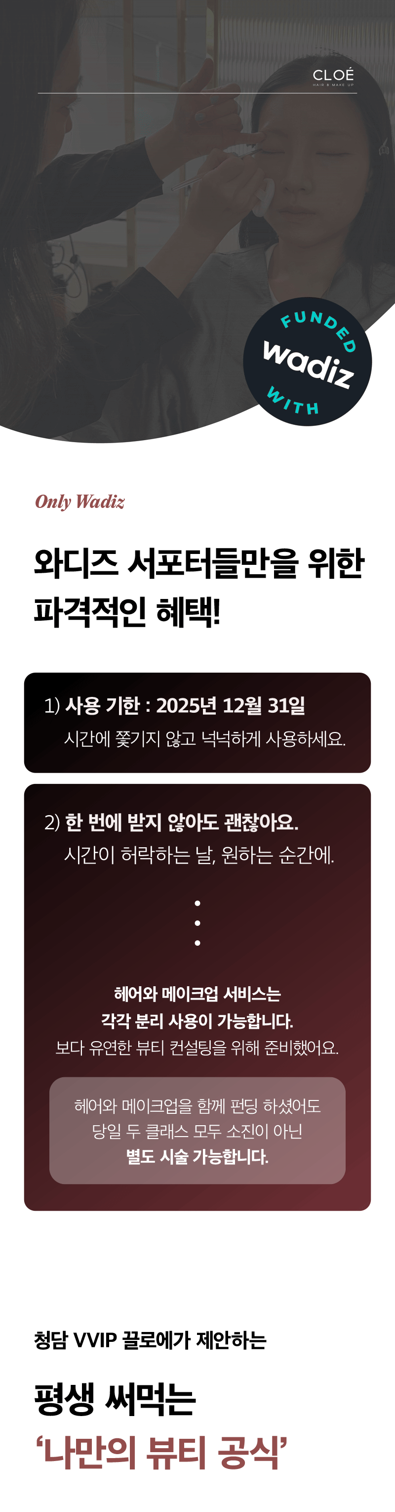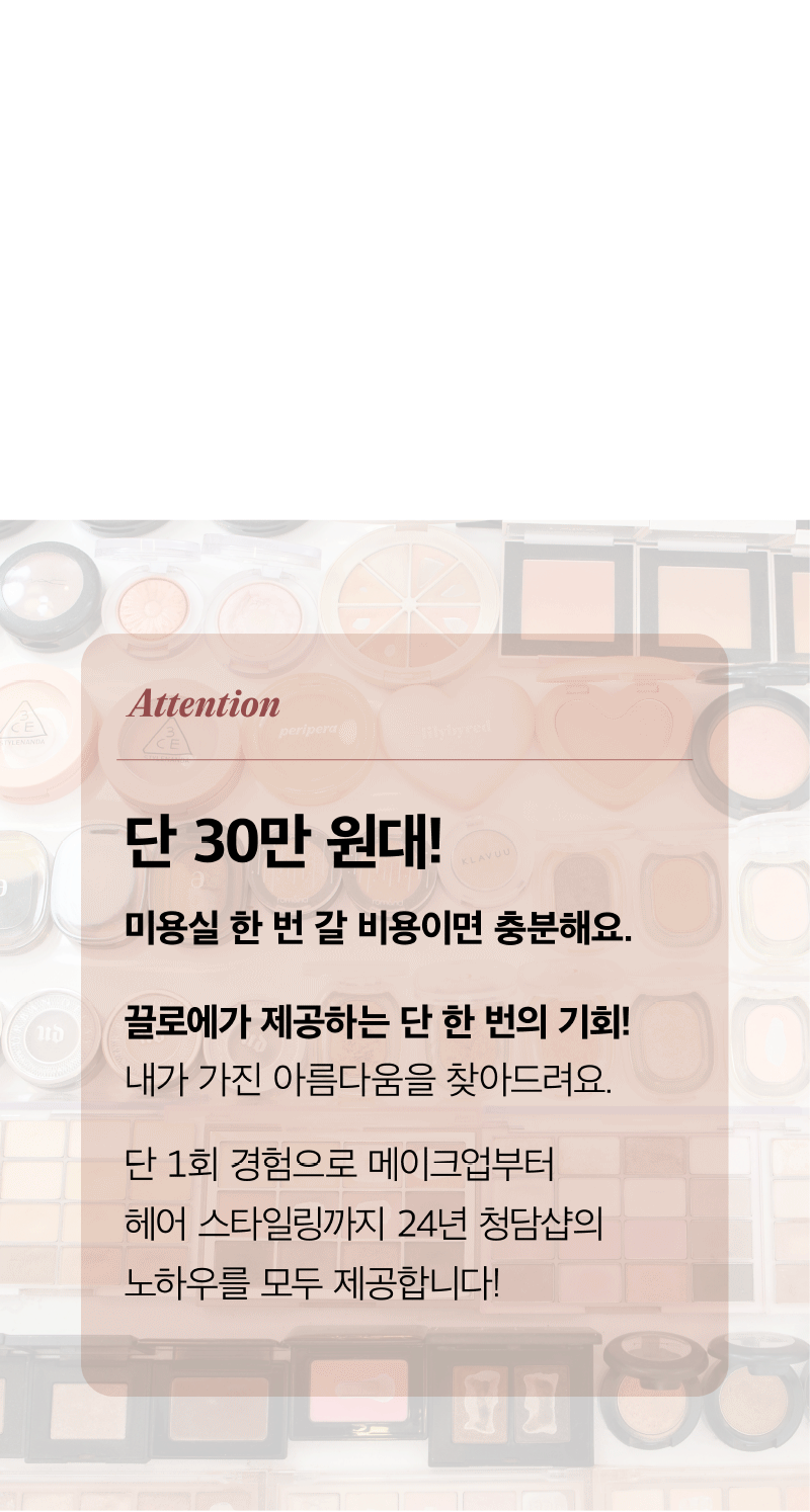 克洛艾 在清潭洞 25年 以上 一直受到喜爱 高端 沙龙 限定的 顾客们 一起 虽然如此 这次 Wadiz 众筹 通过 更多 顾客们 最 适合 搭配的 发型 和 美发,化妆 体验与 咨询 一起 进行 。