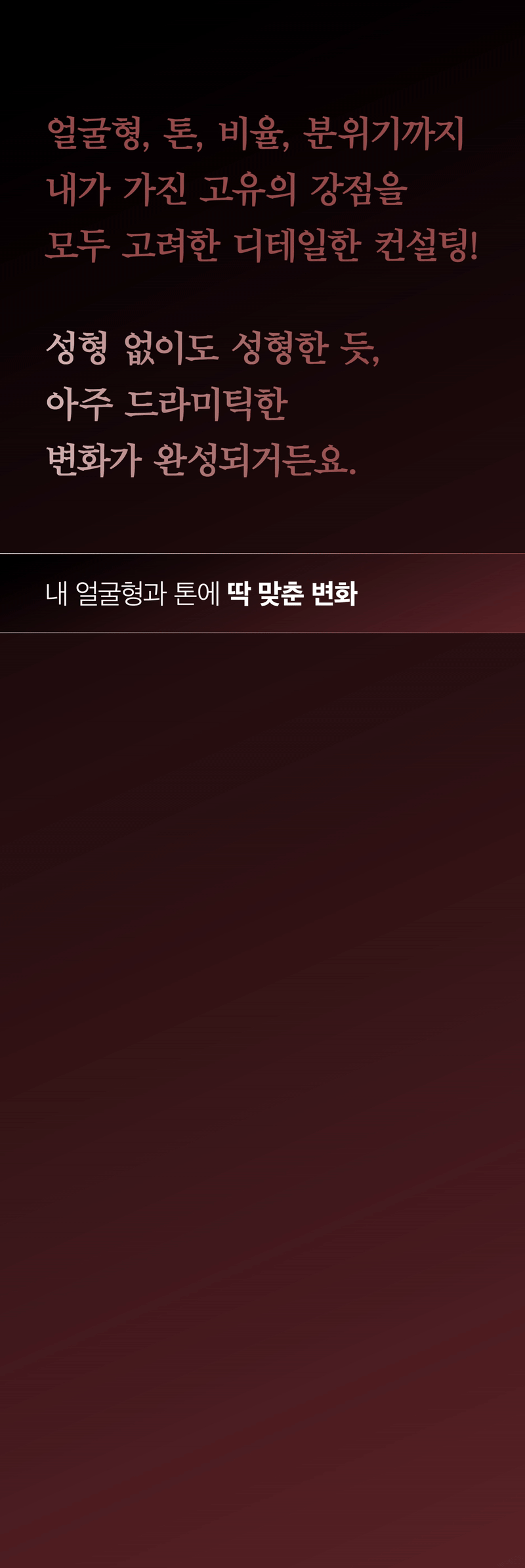 想要从发型到化妆都完美协调的视觉效果吗?Chloe的专家会按照建议的方向为您实际完成造型。Chloe的巧手,将为您重要的一天画上完美句号。重要的会议、拍摄、约会、形象照拍摄的完美选择。通过Chloe独有的造型咨询,为您推荐最适合您的发型与妆容。 在清潭洞顶级艺术家的巧手下,您的魅力将被唤醒。为生活中的重要时刻,设计只属于您的氛围。