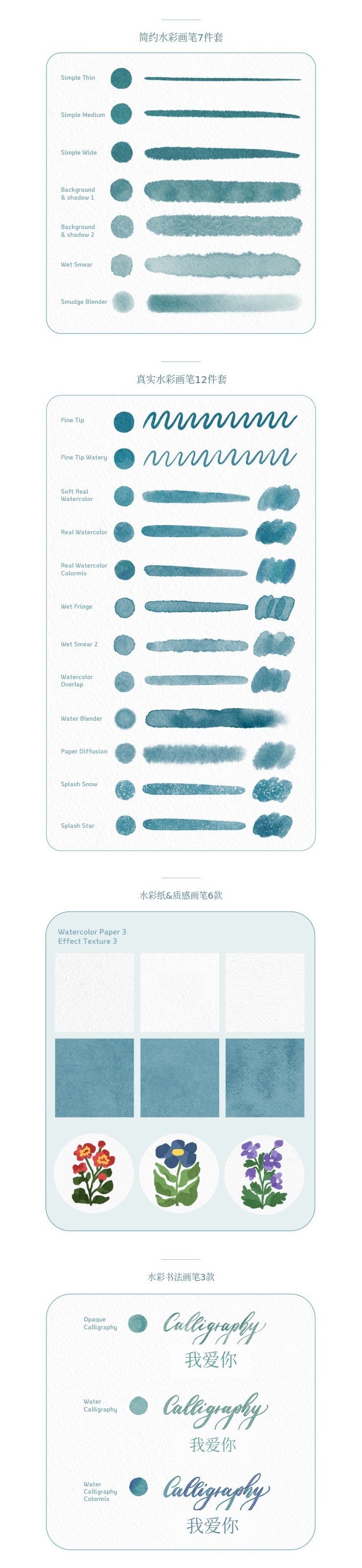 简约水彩7种、真实水彩12种、水彩质感画笔6种、书法画笔3种