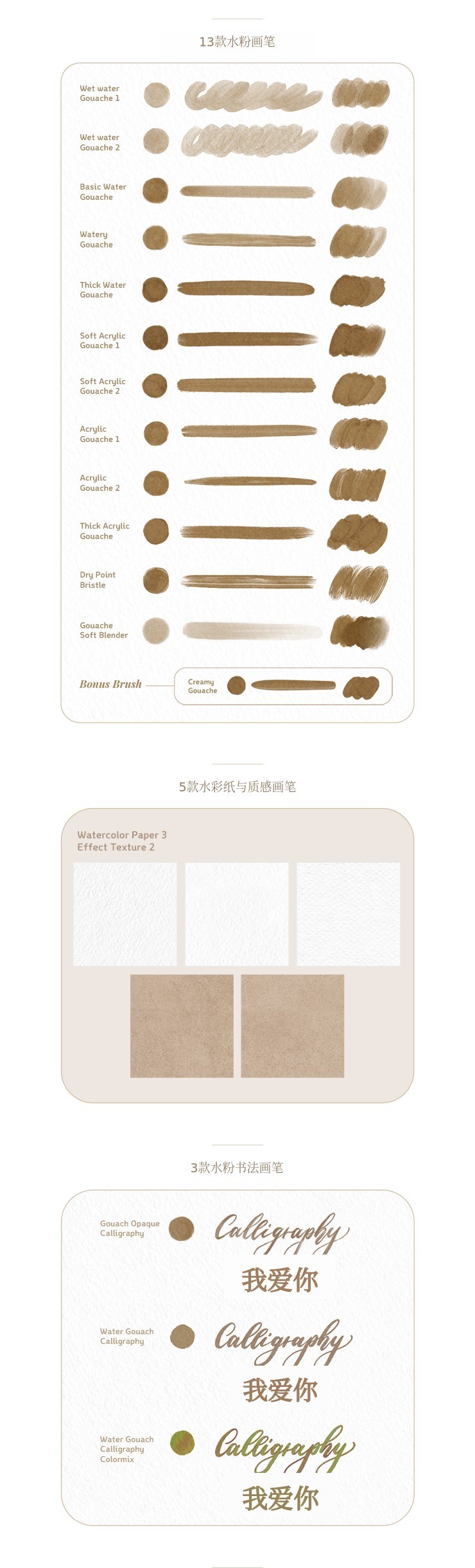 由13种广告色画笔、5种水彩质感画笔、3种广告色书法组成的套装
