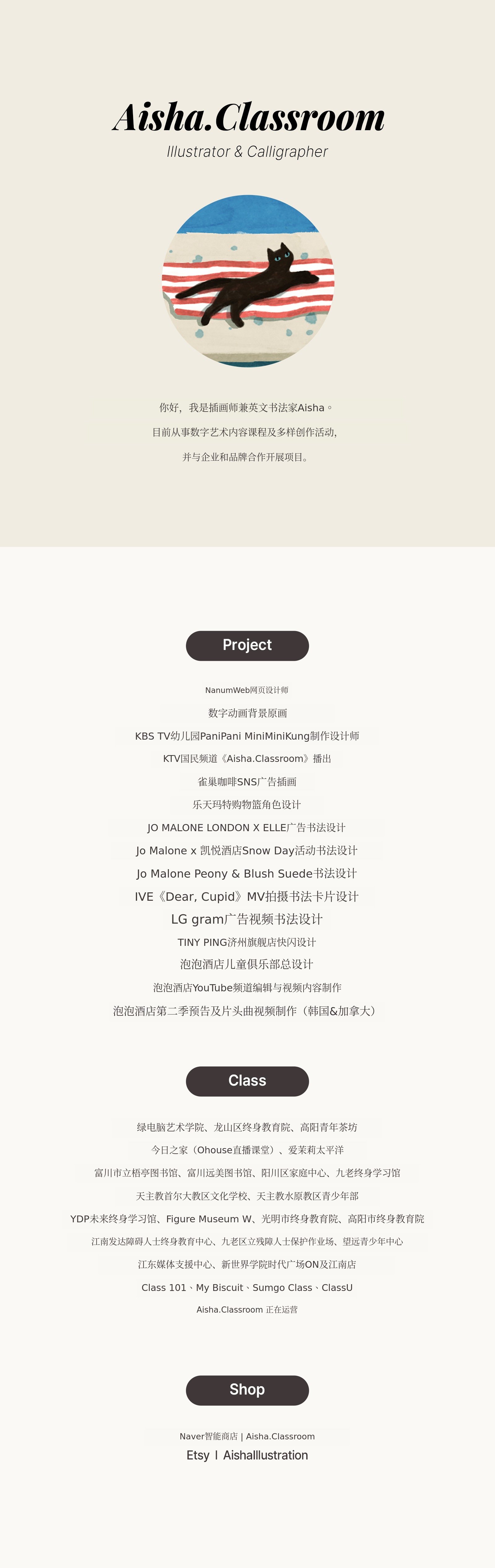 目前正在运营Aisha.Classroom,开展多种艺术内容教育 中。
