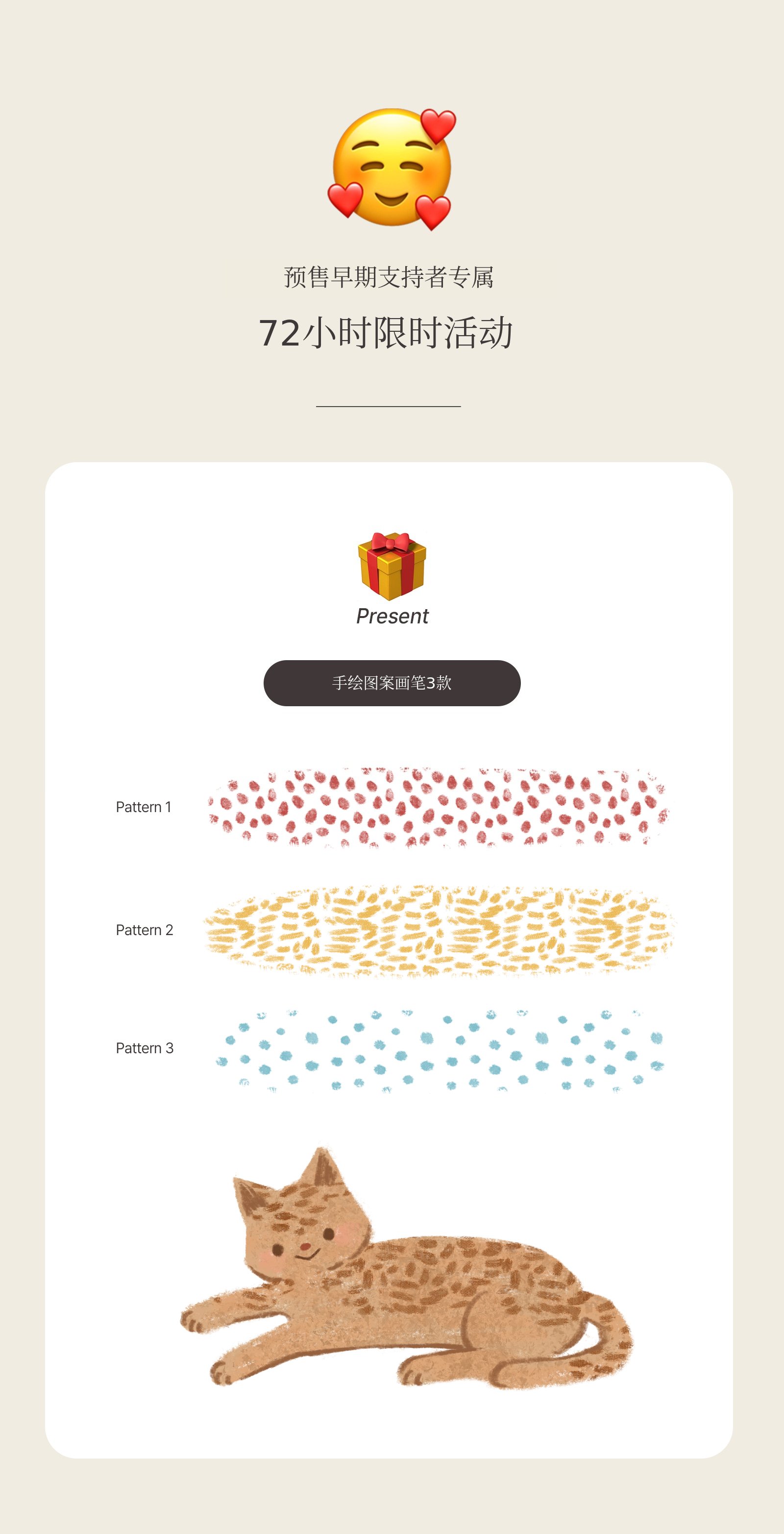 1. 🎨 数字绘画笔刷套装 - 包含124种笔刷和迷你课程 2. ✨ 手工质感数字表现 - 自然纹理与细腻笔触再现模拟感 3. 💸 预购限时优惠 - 最高50%折扣及迷你课程视频