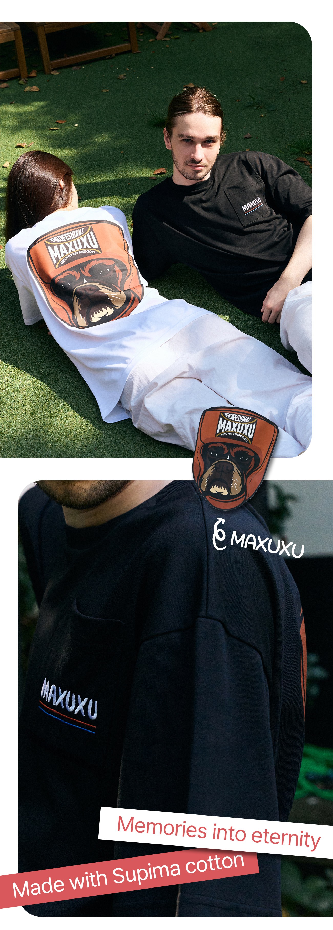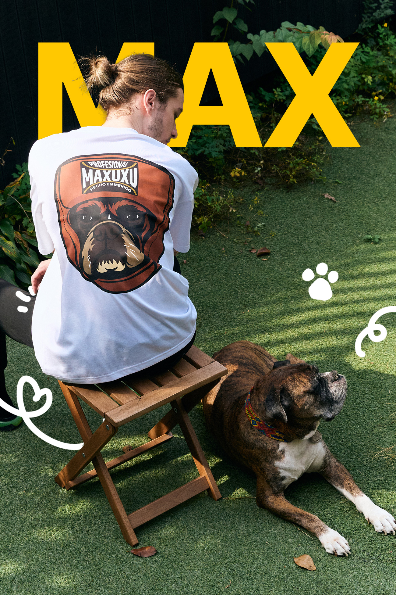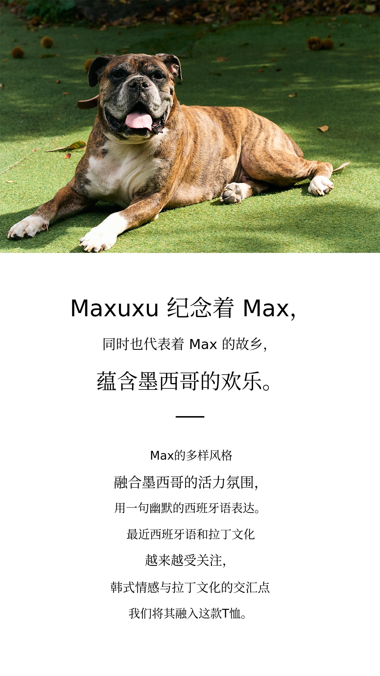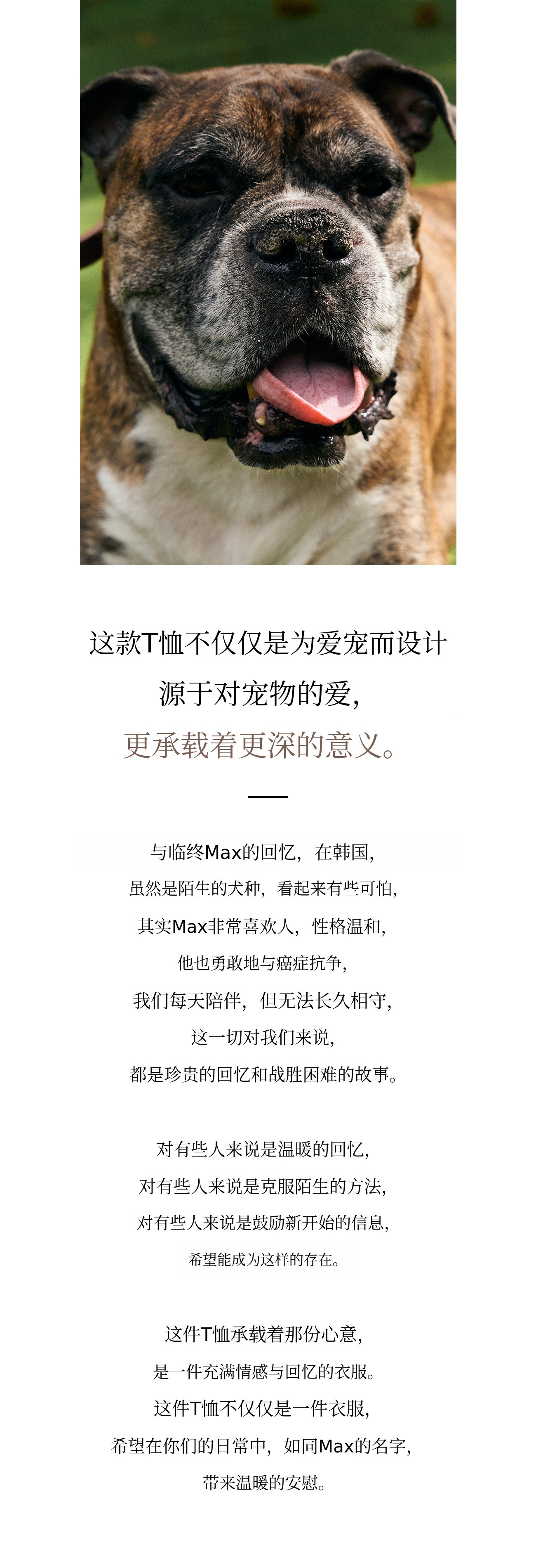 每位宠物主人和宠物狗都有属于自己的特别故事吧?我也想要纪念我那特别又珍贵的爱犬,所以想要制作一个能融入日常、随时陪伴在身边的东西。为了融入日常,必须经常拿在手上,或总是在身上的某个地方,所以我选择了大家都喜欢穿的T恤作为起点,并加入了体现拳师犬品种特点的非常可爱的设计。