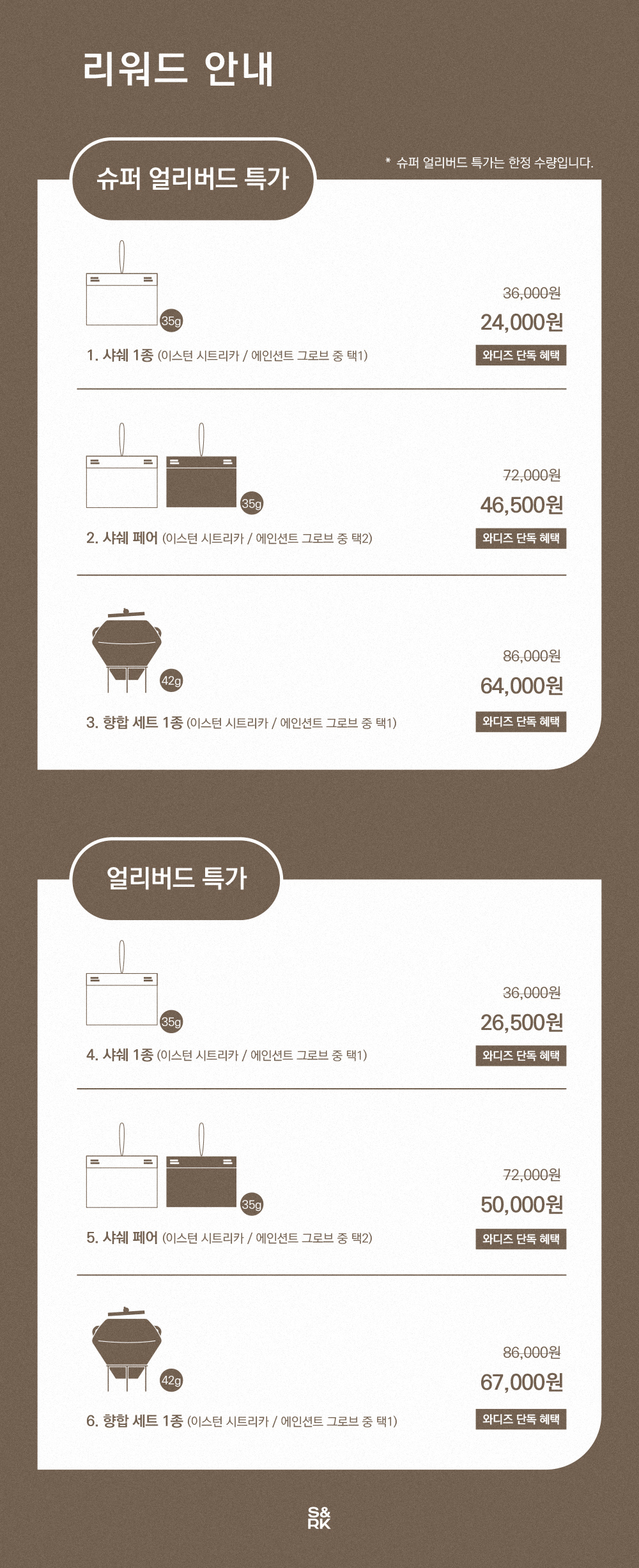 리워드는 2개의 타입(행거형 샤쉐, 거치형 향합)과 2개의 향(시트러스, 우디) 중에서 선택할 수 있습니다.