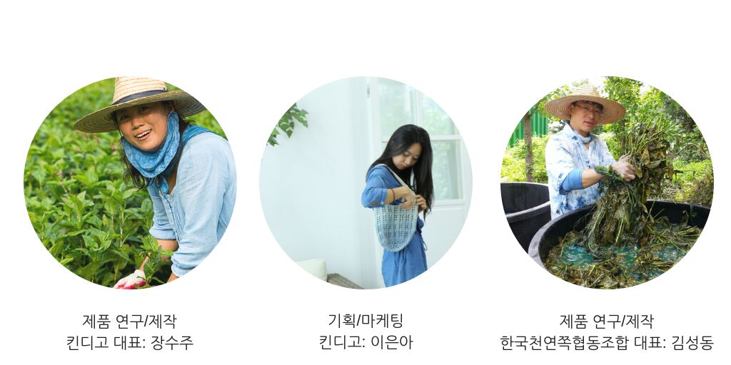 킨디고 제품에 사용되는 쪽빛 파란 염료는 물과 공기가 맑은 이천/홍천 산골짜기에 위치한 친환경 쪽밭에서 재배된 쪽풀에서 추출합니다. 우리 조상들이 사용하던 전통 쪽염색 방법을 활용하여, 자연의 힘과 재료만으로 색소 추출과 자연발효하여 염색합니다. 킨디고는 한국천연쪽협동조합과 함께 합니다.