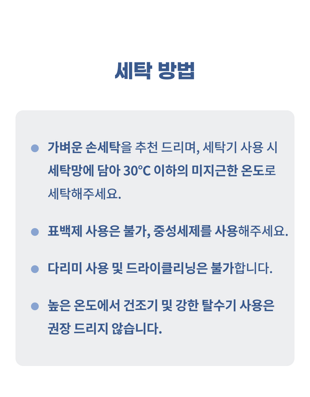 표백제 및 락스 사용이 불가하며 건조기 및 탈수기 사용은 자연건조 또는 약한 정도로만 진행해주세요.